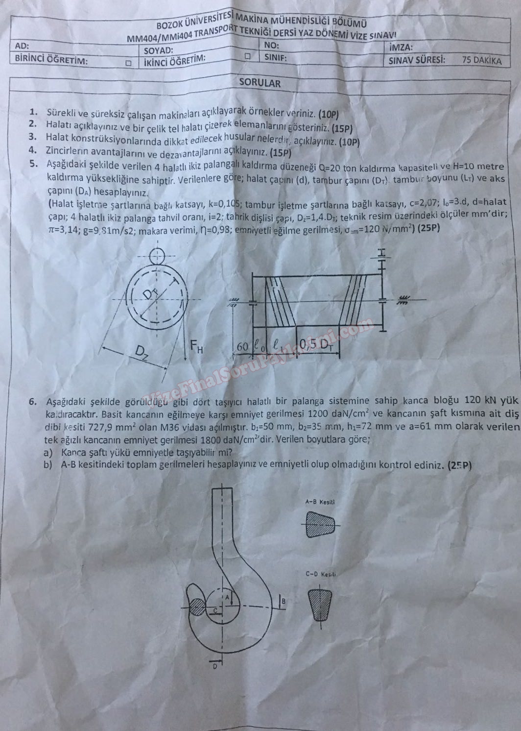 Transport Tekniği Vize Soruları Bozok Üniversitesi Yaz Okulu Makine Mühendisliği Yozgat