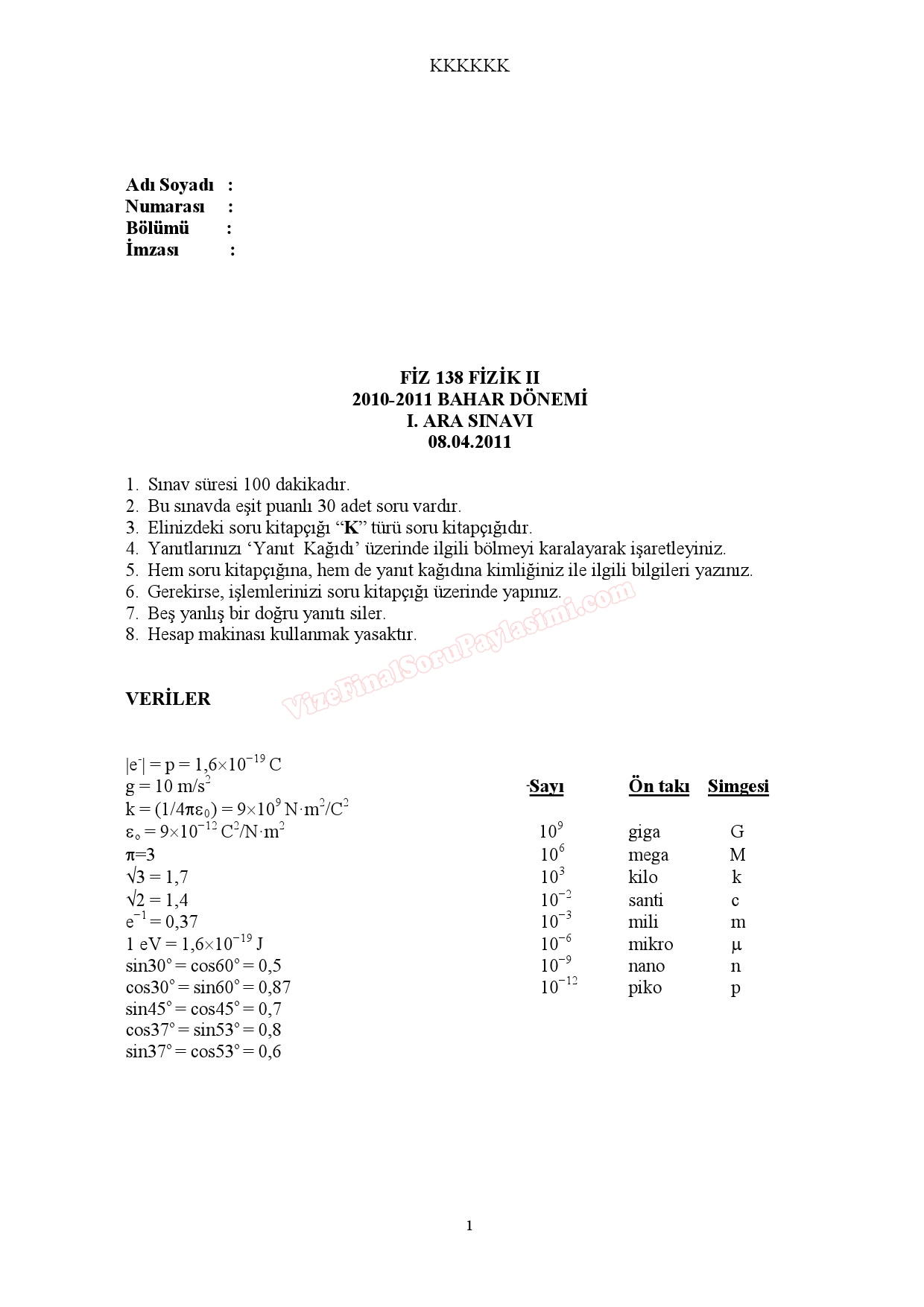 Genel Fizik 1 Vize Sınav Soruları Gece 2011 26-03-2015, 05:54