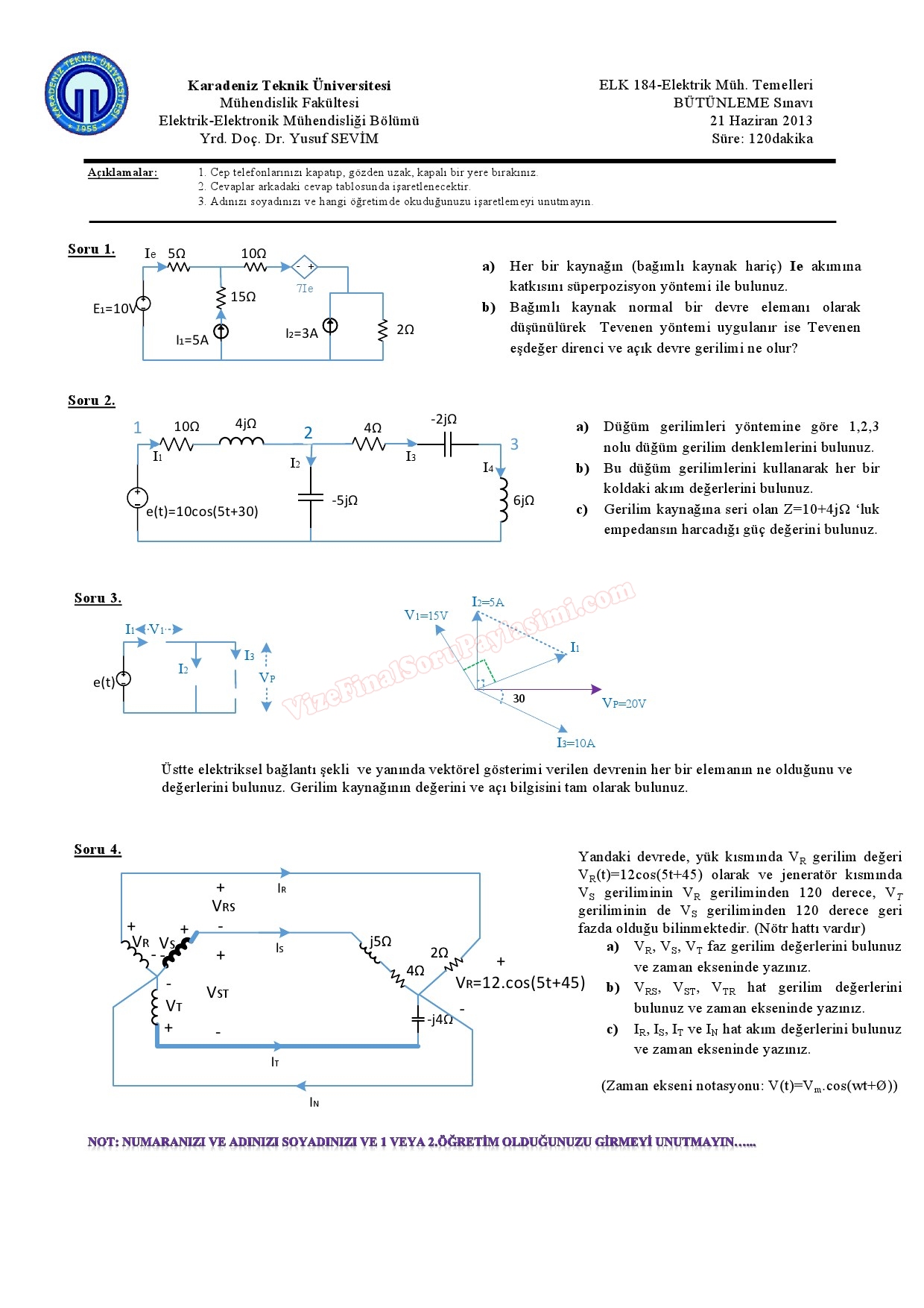 Elektrik Elektronik Mühendisliğinin Temelleri Bütünleme Soruları 2013 Karadeniz Teknik Üniversitesi ktu
