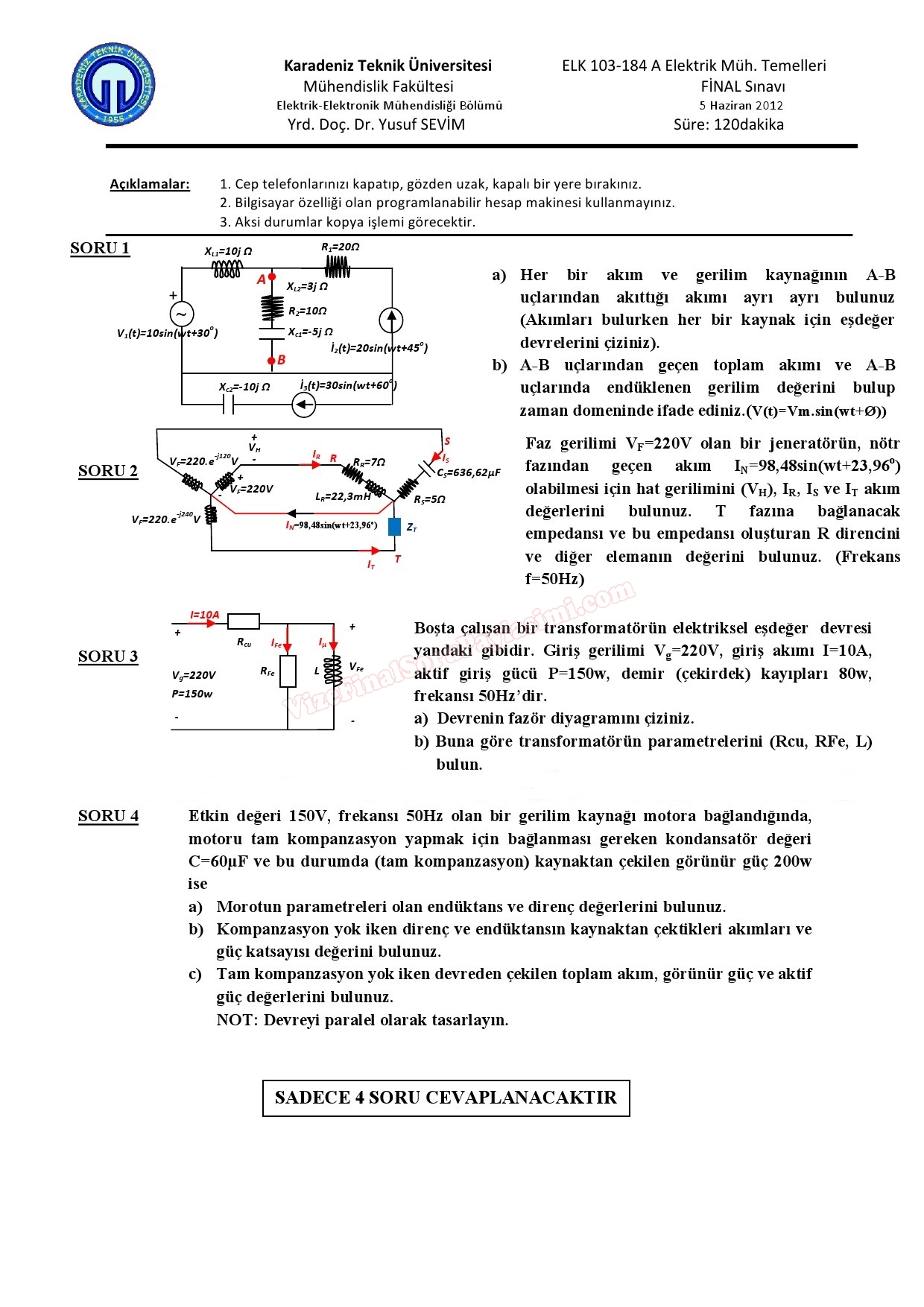 Elektrik Elektronik Mühendisliğinin Temelleri Final Soruları Genel Sınav Soruları Karadeniz Teknik Üniversitesi ktu 2012 GERİ DÖN-