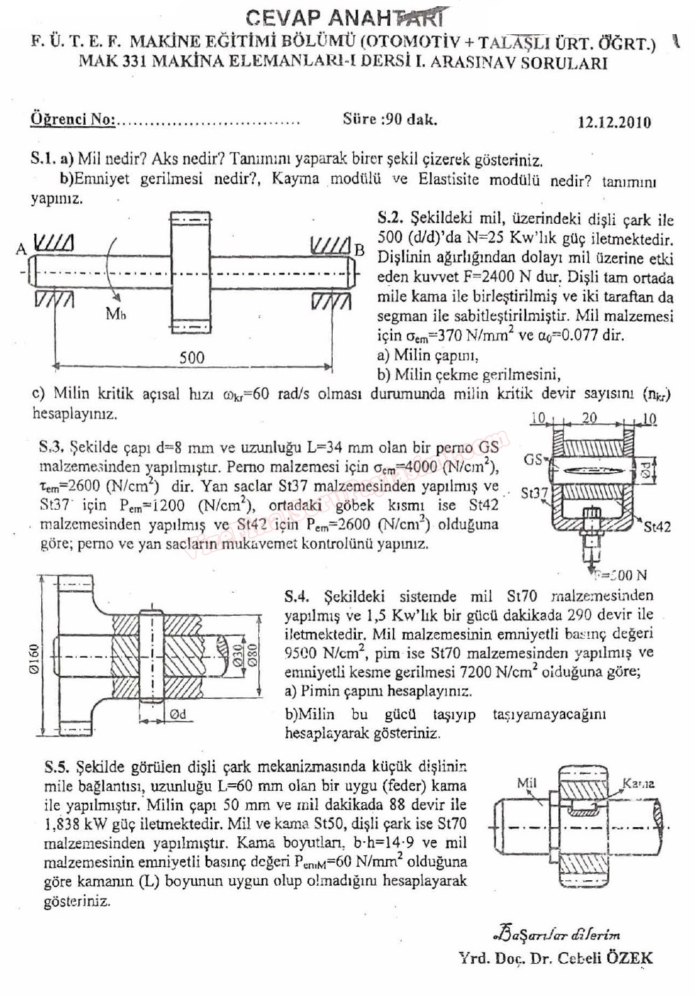 Makina Elemanları -1 Arasınav Soruları Vize Soruları 2010 Fırat Üniversitesi fu