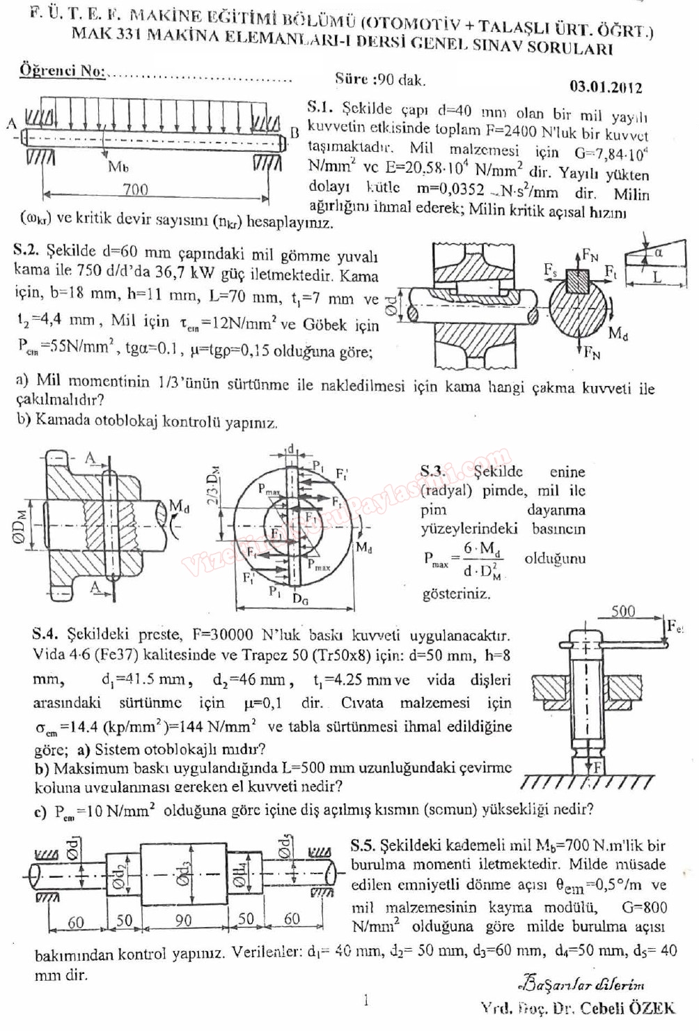 Makina Elemanları -1 Genel Sınav Soruları Final Soruları 2012 Fırat Üniversitesi GERİ DÖN-