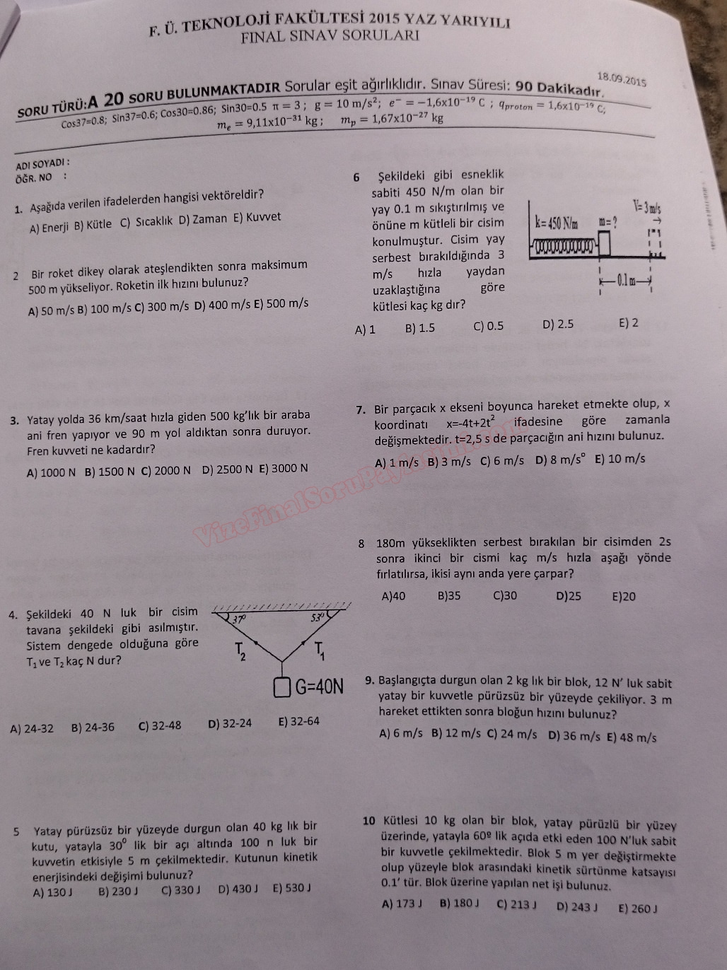 Fizik -1 Fizik fizik1 fizik 1 final soruları test Fırat Üniversitesi