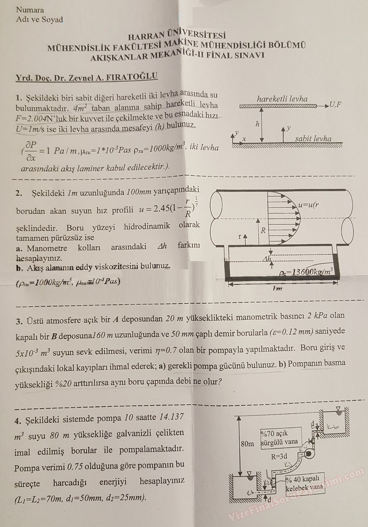 Harran Üniversitesi Akışkanlar Mekaniği -2 final soruları