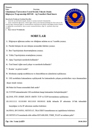Ağ Temelleri Final Soruları 2014 14-01-2016, 06:00