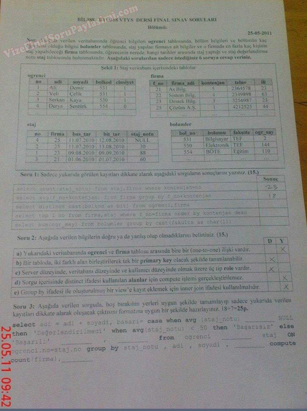 Veri Tabanı Yönetimi Final Soruları 20-01-2016, 18:45
