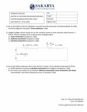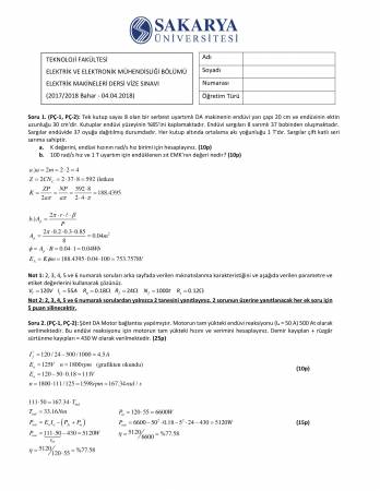 Vize ve Final Soruları / Sakarya Üniversitesi / Elektrik Makinaları-1