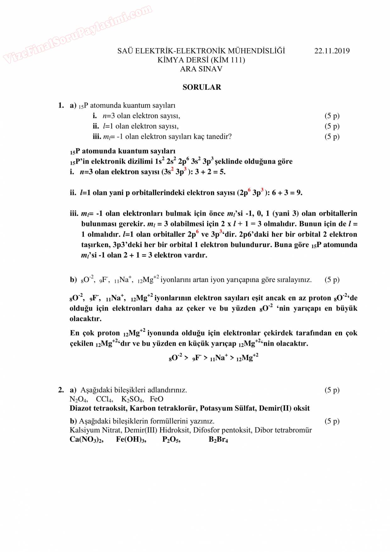 Vize ve Final Soruları / Sakarya Üniversitesi / Kimya Dersi