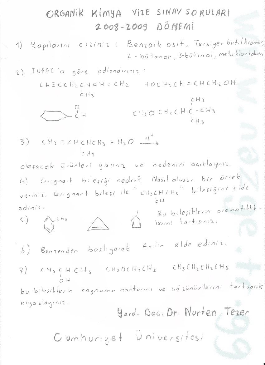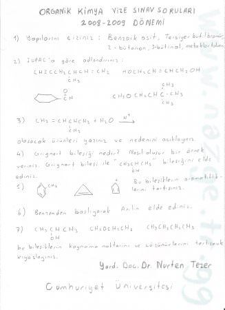 Vize ve Final Soruları / Cumhuriyet Üniversitesi / Organik Kimya Dersi