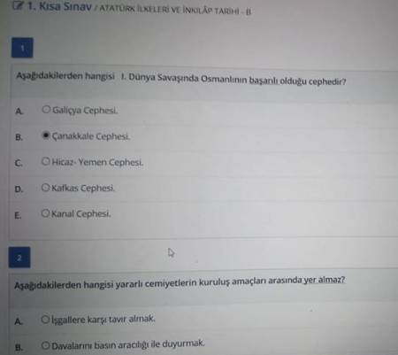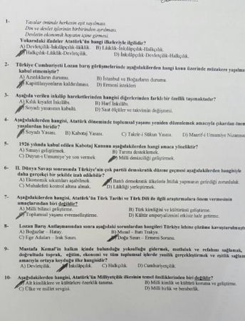 Atatürk İlkeleri ve İnkilap Tarihi 1. Kısa Sınav Soruları 29-10-2018, 19:18