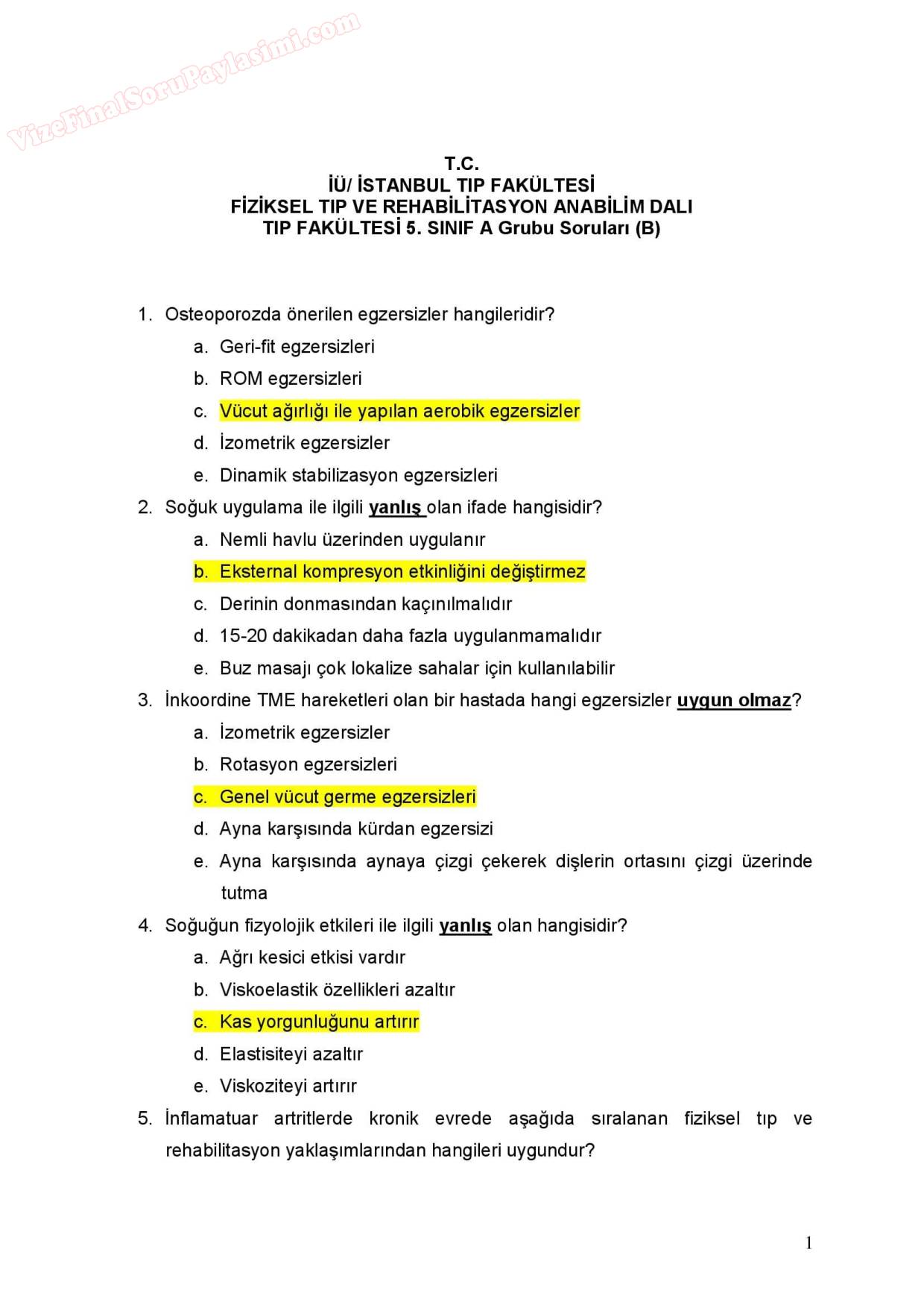 Vize ve Final Soruları / İstanbul Üniversitesi / Fiziksel Tıp ve Rehabilitasyon Dersi