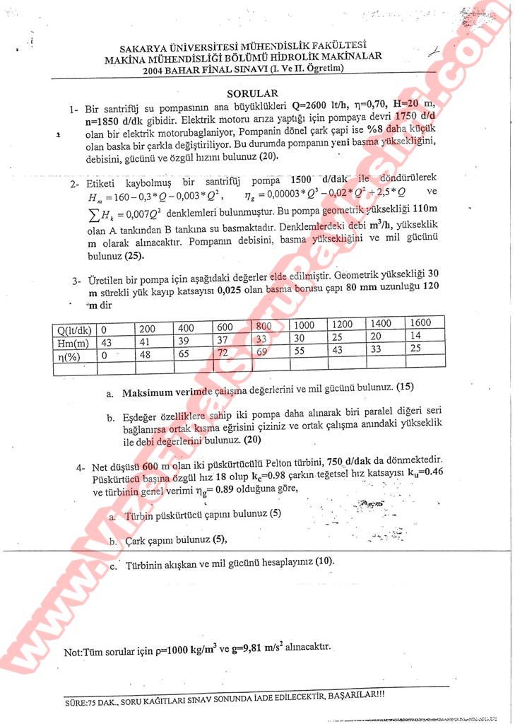 Vize ve Final Soruları / Sakarya Üniversitesi / Hidrolik Makinaları Dersi