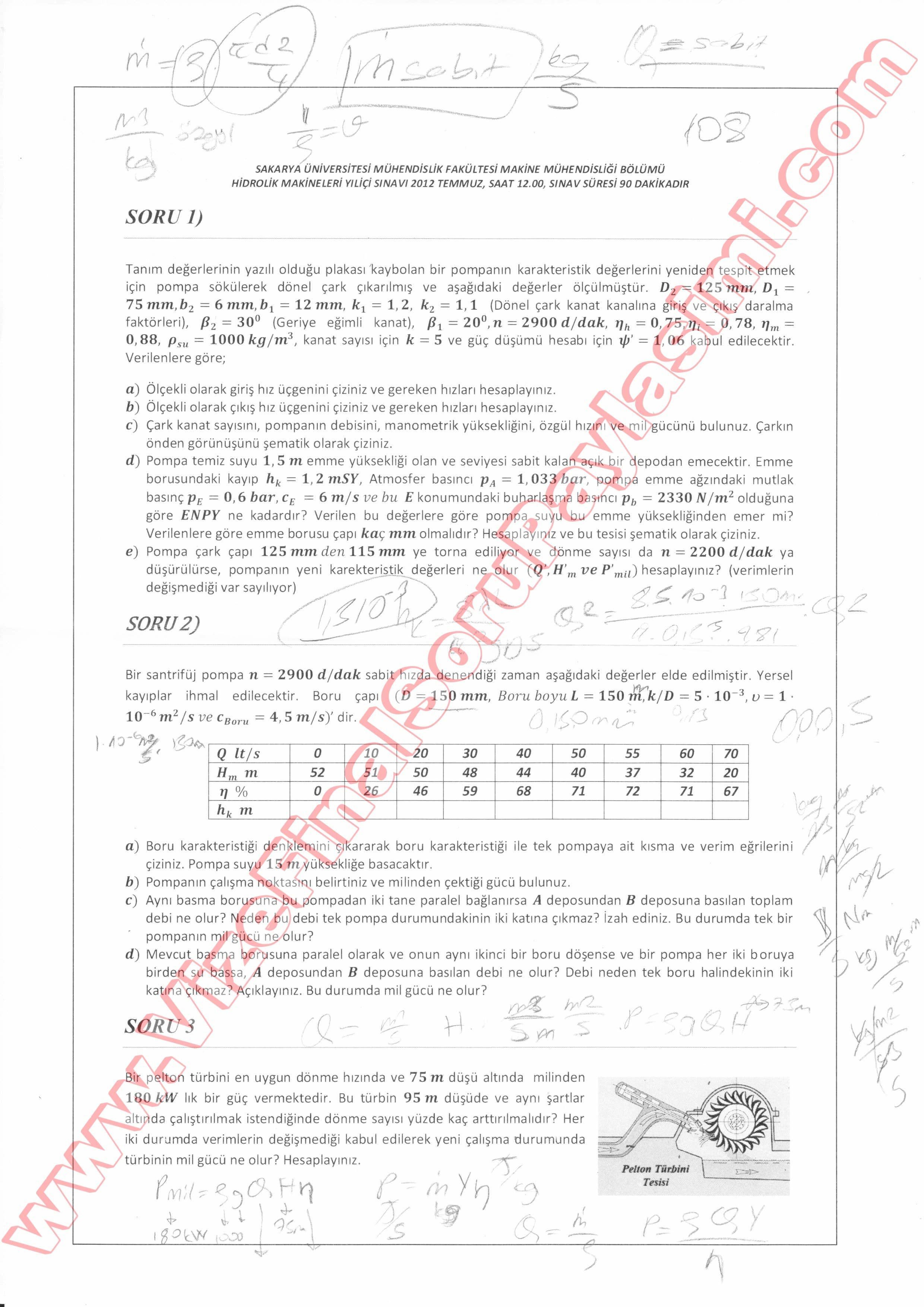Vize ve Final Soruları / Sakarya Üniversitesi / Hidrolik Makinaları Dersi