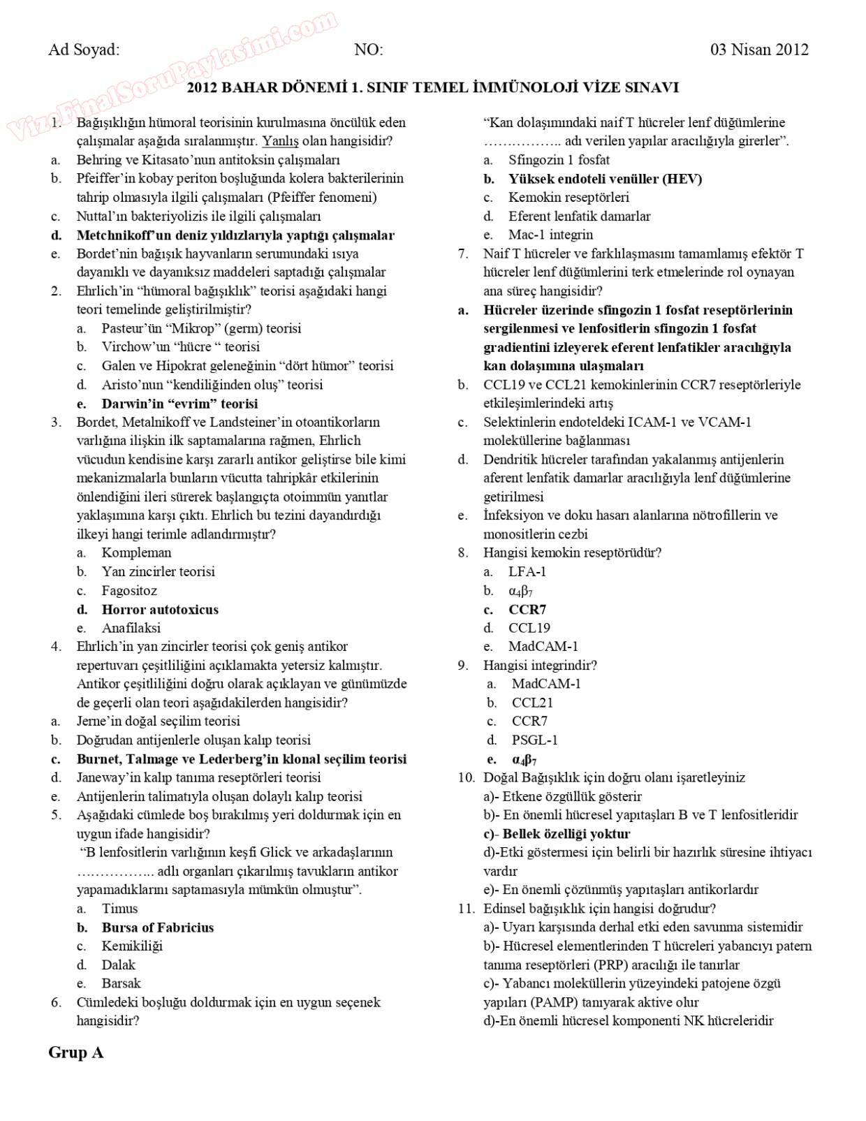 Vize ve Final Soruları / İstanbul Üniversitesi / Temel İmmünoloji Dersi