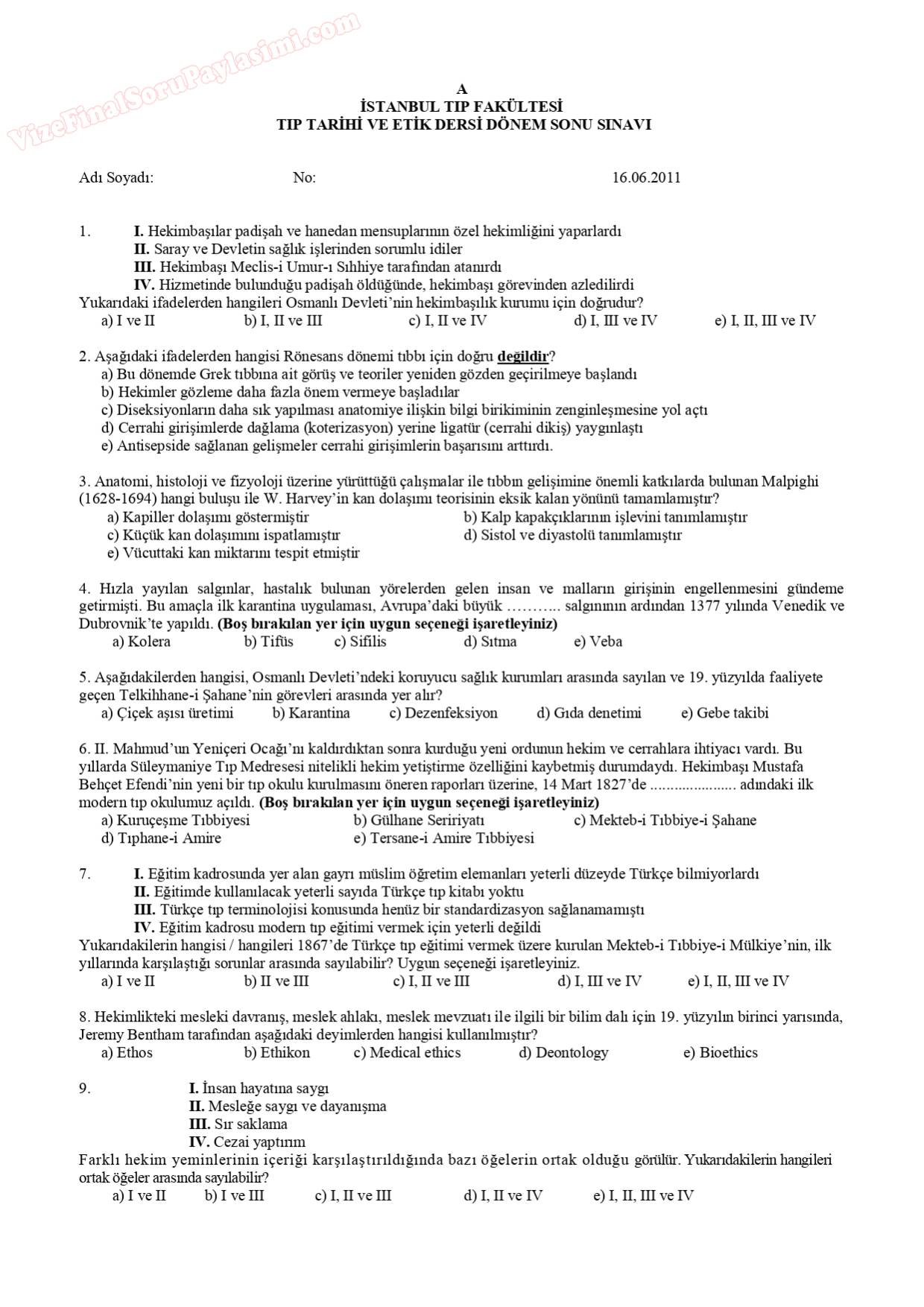 Tıp Tarihi ve Etik Final Sınav Soruları