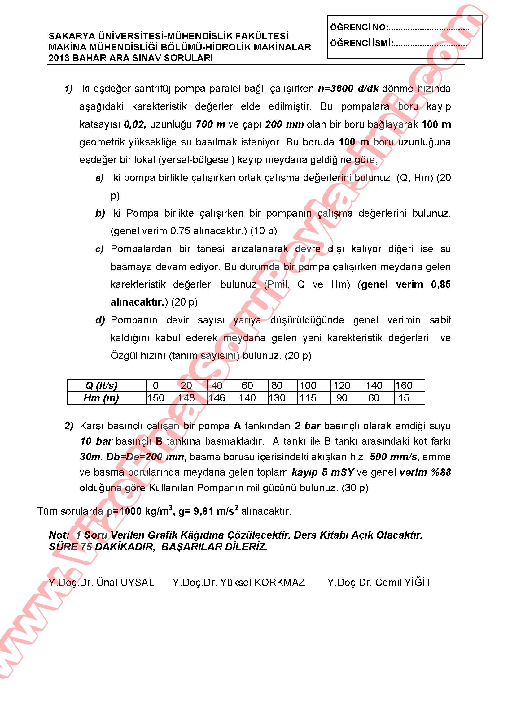 Vize ve Final Soruları / Sakarya Üniversitesi / Hidrolik Makinaları Dersi
