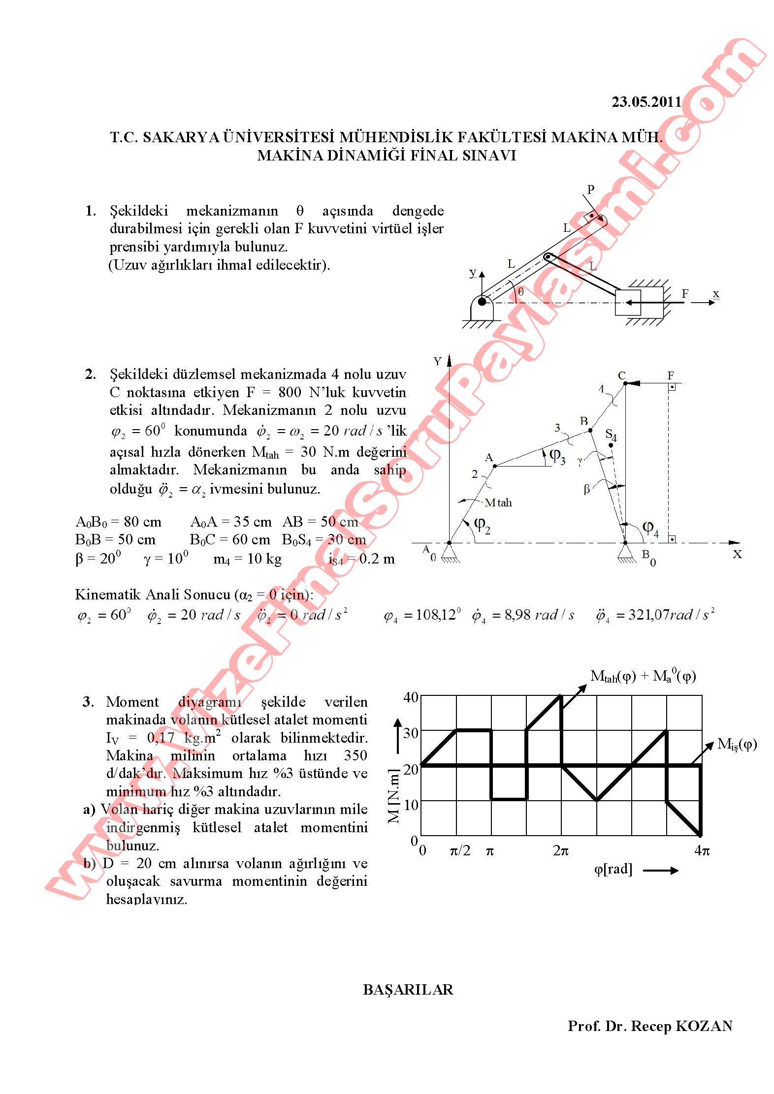 Vize ve Final Soruları / Sakarya Üniversitesi / Makina Dinamiği Dersi