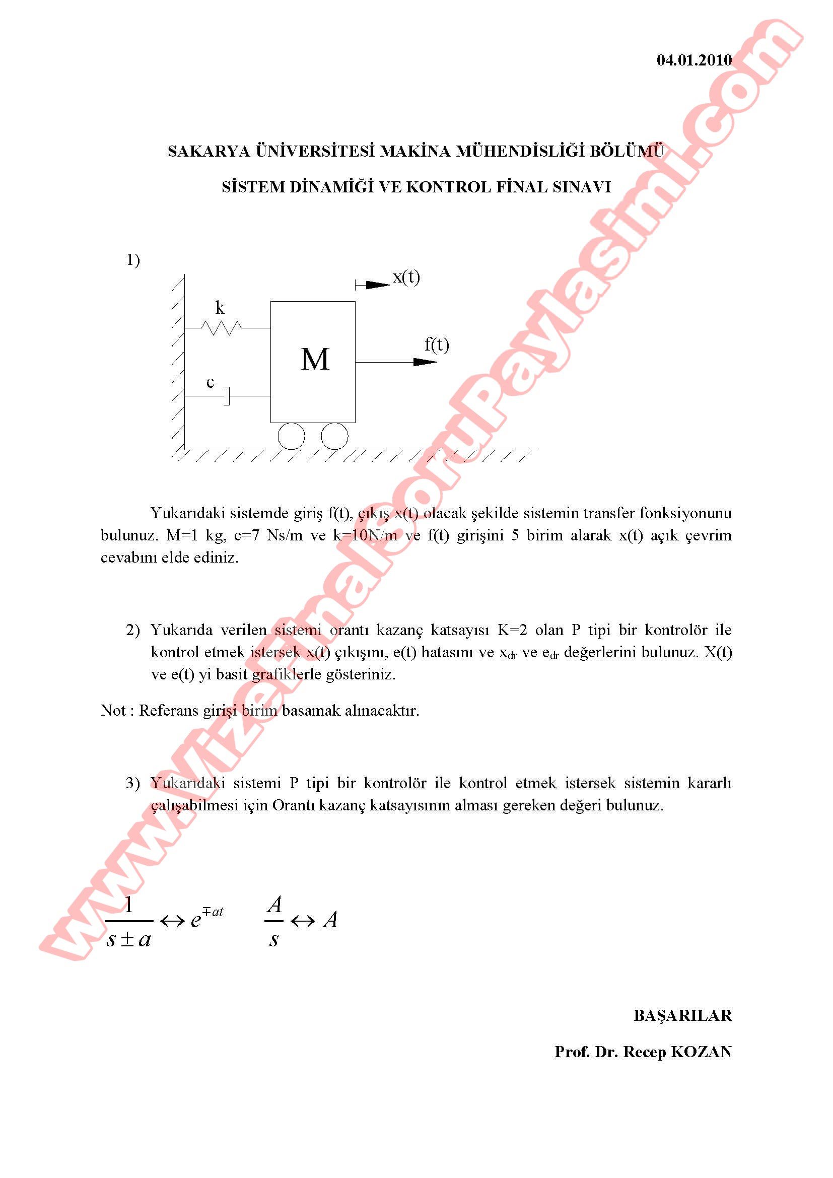 Vize ve Final Soruları / Sakarya Üniversitesi / Sistem Dinamiği ve Kontrol Dersi