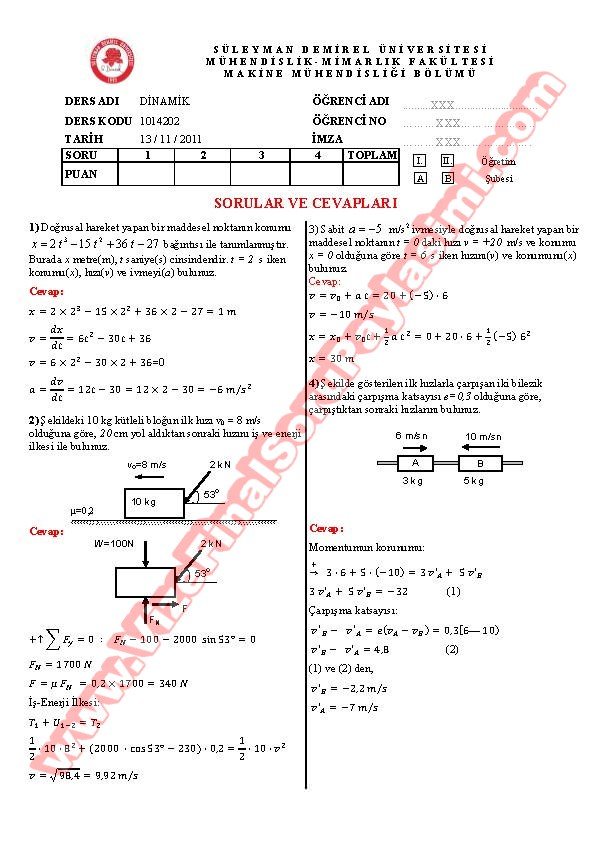 Vize ve Final Soruları / Süleyman Demirel Üniversitesi / Dinamik