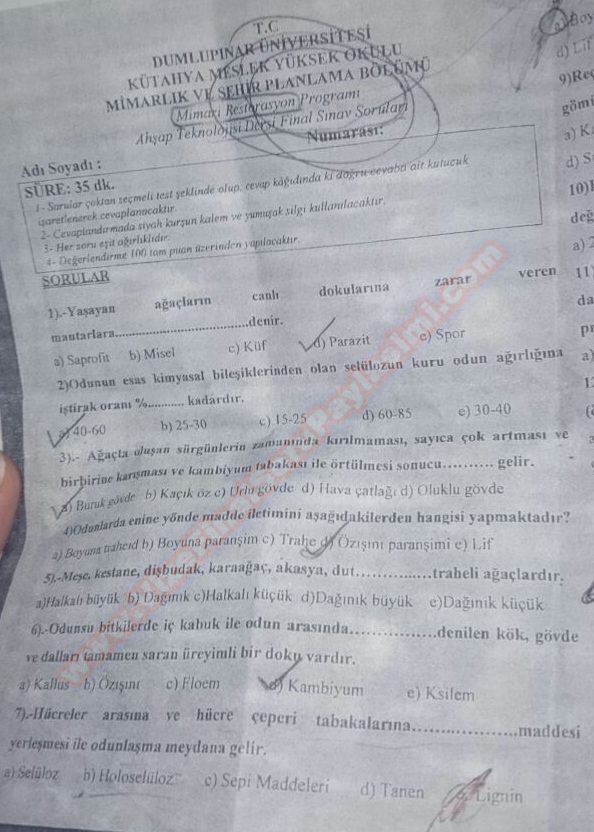 Vize ve Final Soruları / Dumlupınar Üniversitesi / Ahşap Teknolojisi Dersi
