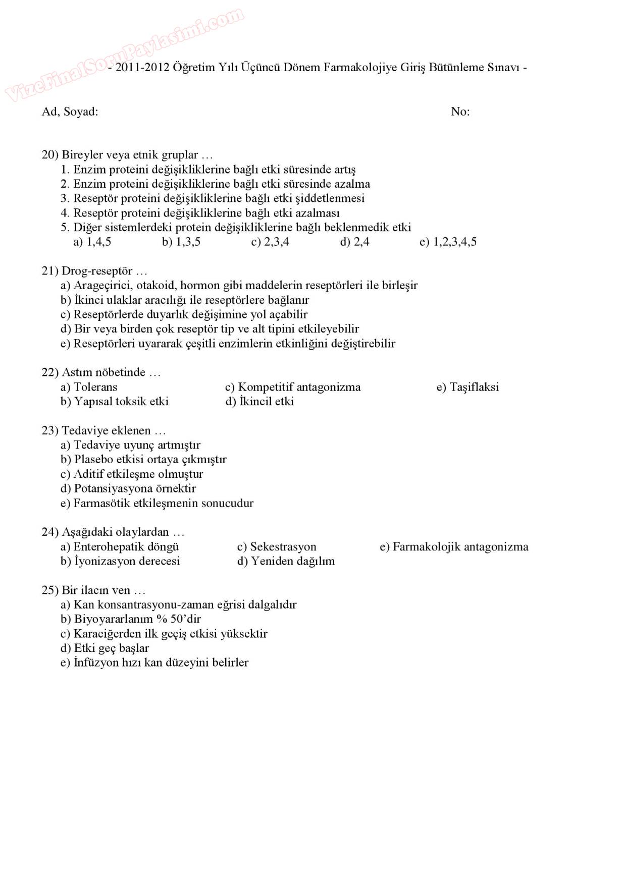 Farmakolojiye Giriş Dersi Bütünleme Sınav Soruları
