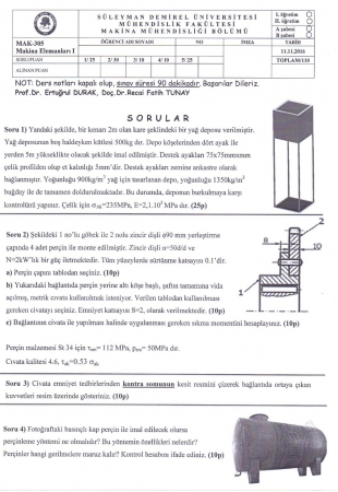 Anahtar Kelimeler: Makine Elemanları -1 Vize Soruları ve Cevapları Süleyman Demirel Üniversitesi SDÜ 2016