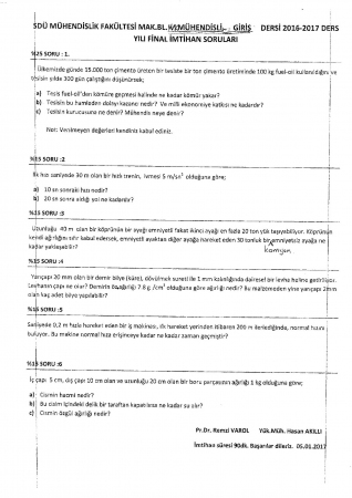 Anahtar Kelimeler: Makine Mühendisliğine Giriş MMG MMG Süleyman Demirel Üniversitesi Mühendisliğe Giriş Final Soruları ve Cevapları 2017 SDÜ