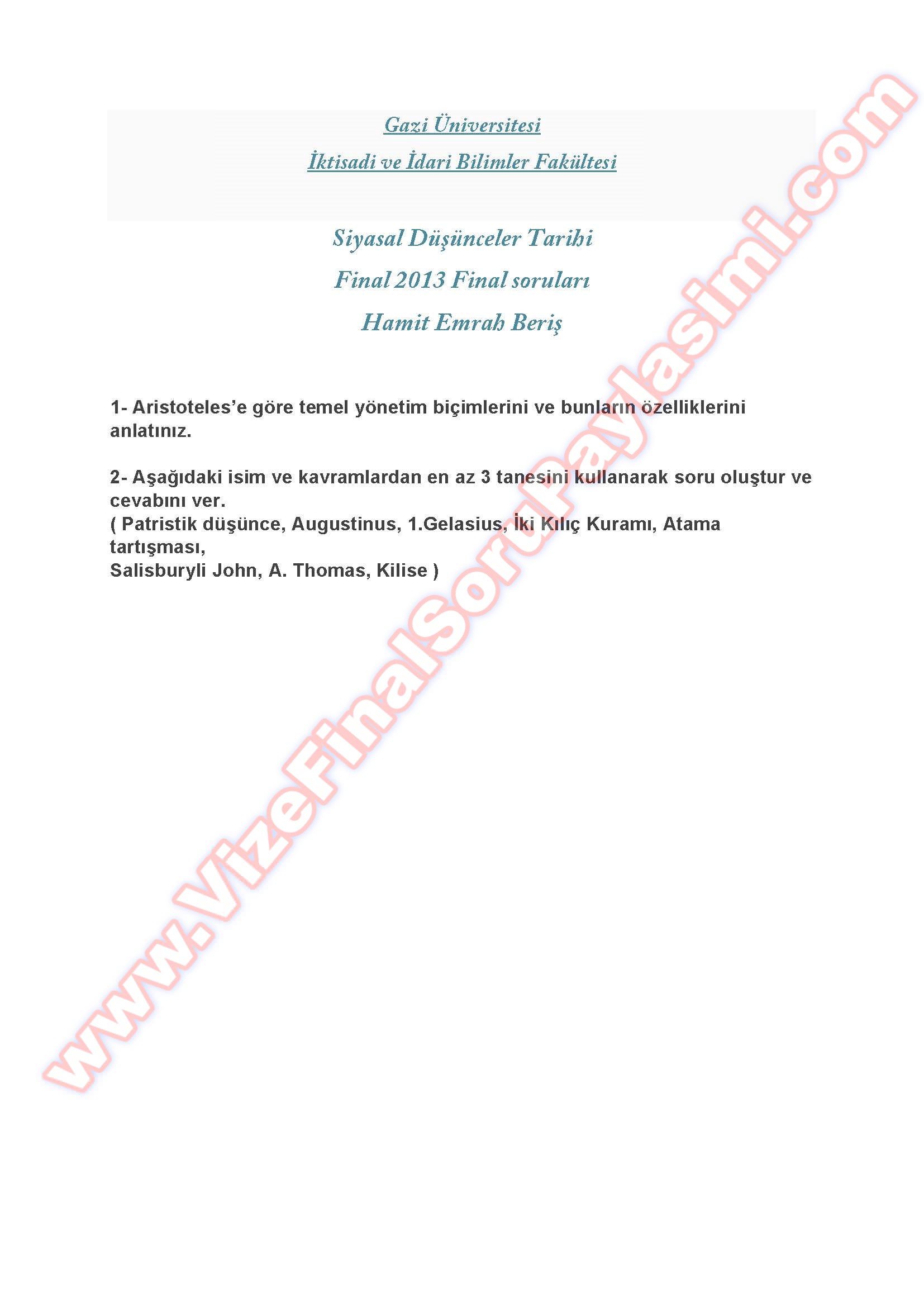 Vize ve Final Soruları / Gazi Üniversitesi / Siyasi Düşünceler Tarihi Dersi