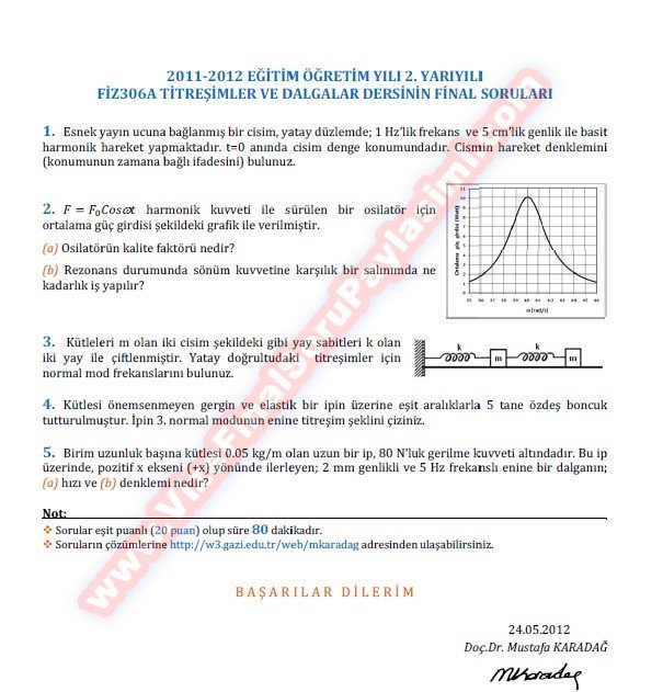 Vize ve Final Soruları / Gazi Üniversitesi / Titreşimler ve Dalgalar Dersi