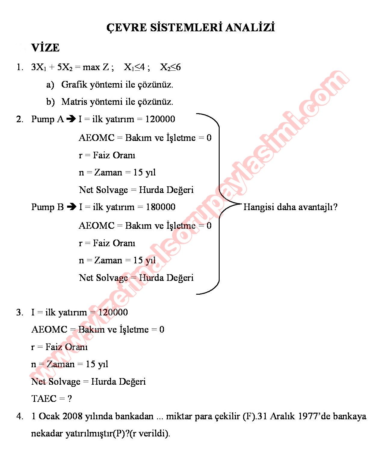 Vize ve Final Soruları / Kocaeli Üniversitesi / Çevre Sistemleri Analizi Dersi