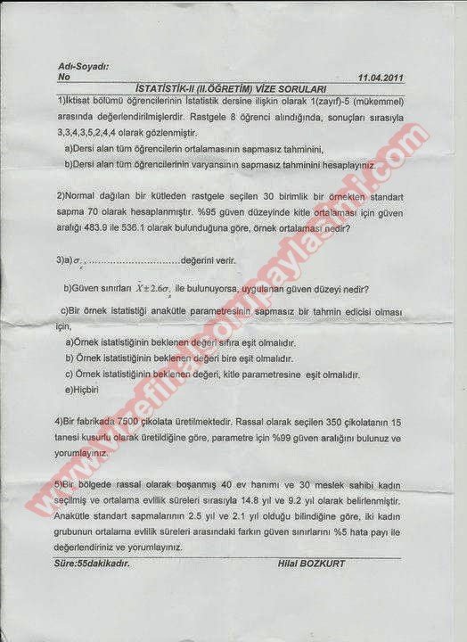 İstatistik 2 Vize Soruları-2005 4-11-2014, 13:36