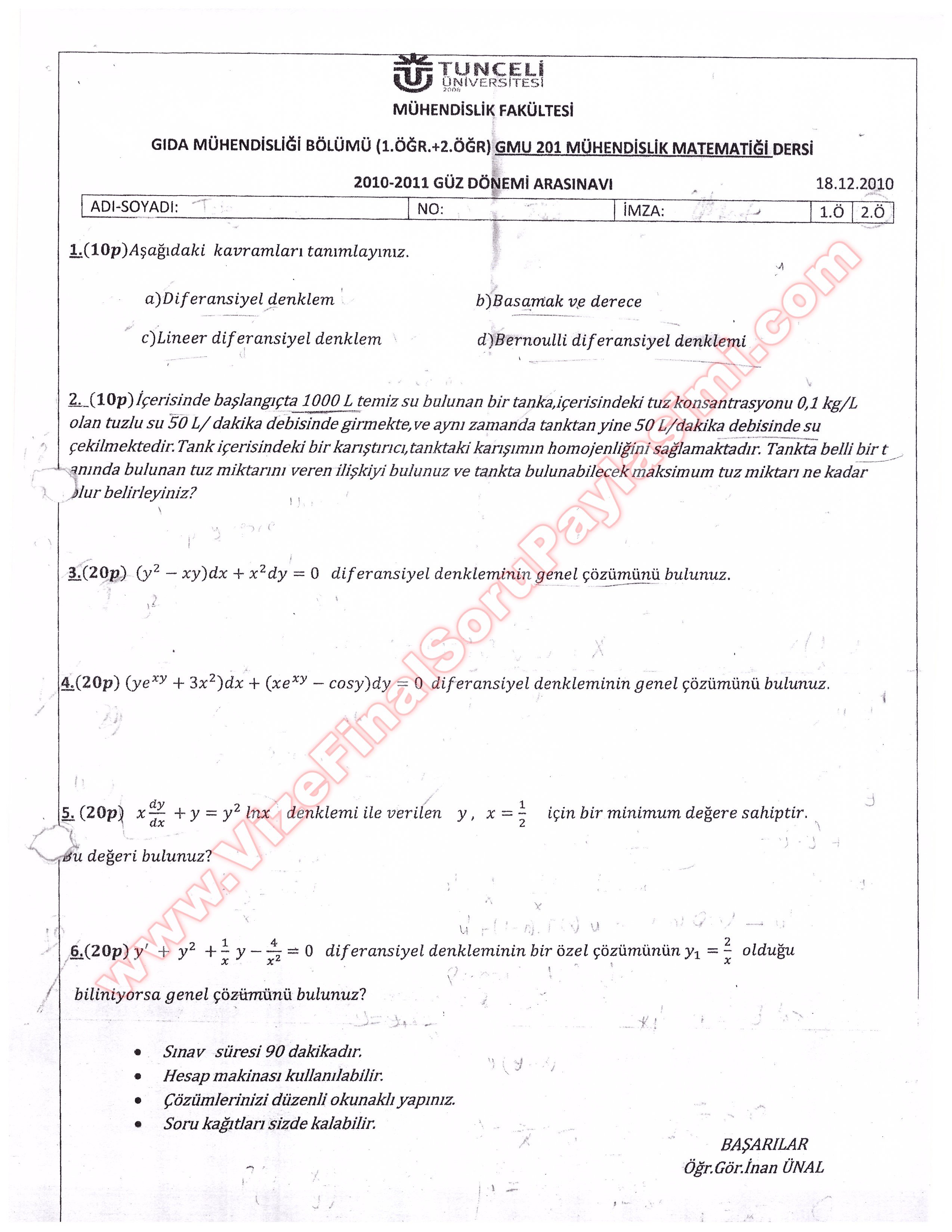 Tunceli Üniversitesi Mühendislik Matematiği Diferansiyel Denklemler -Vize Soruları 21-07-2014, 02:08