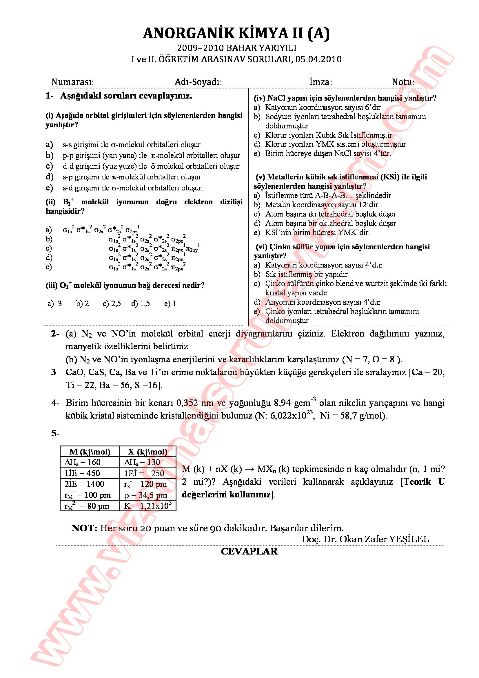 Vize ve Final Soruları / Eskişehir Osmangazi Üniversitesi / Anorganik Kimya -2