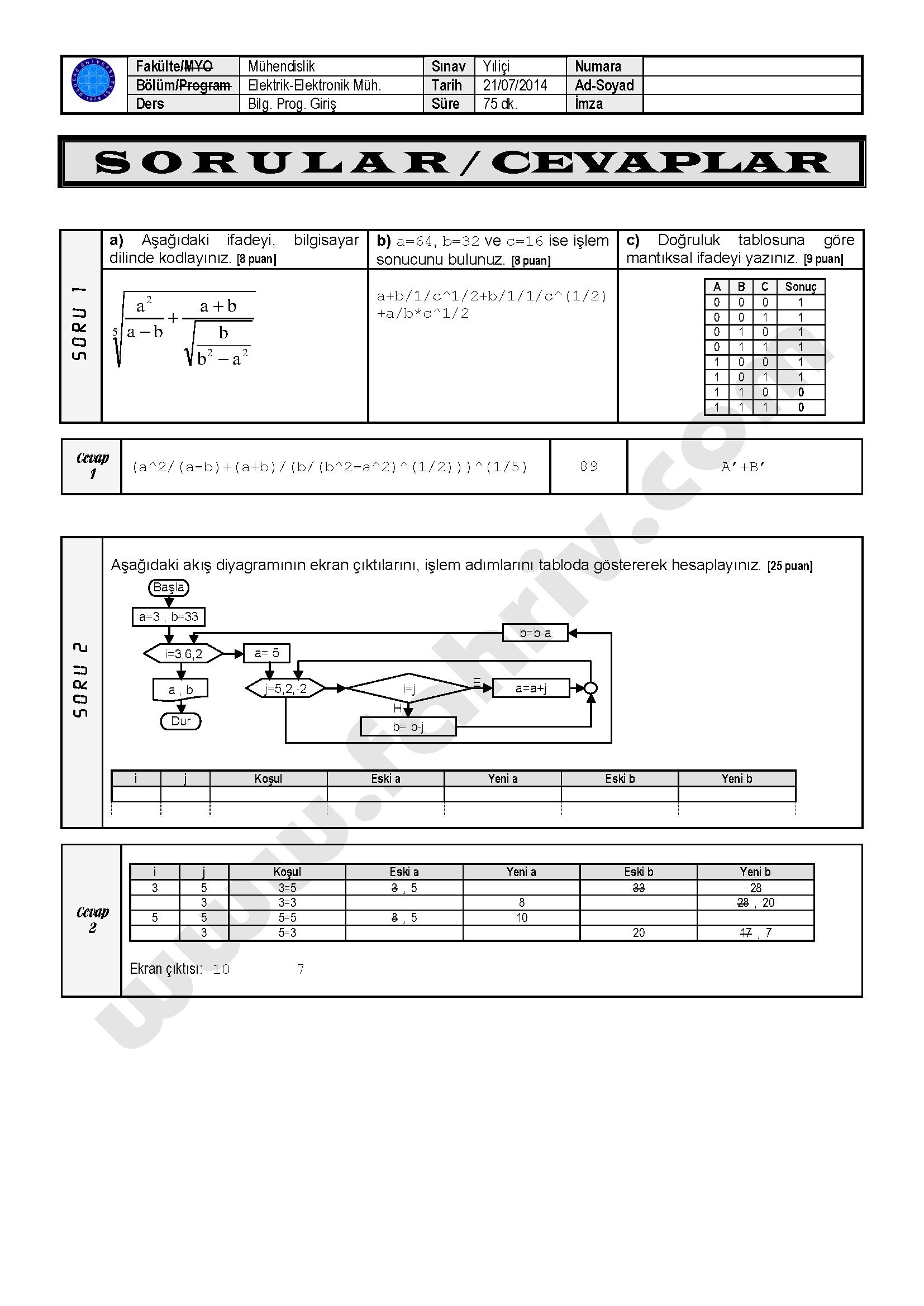 Bilgisayar Programlama Giriş Yaz Okulu Vize Soruları - 21.07.2014