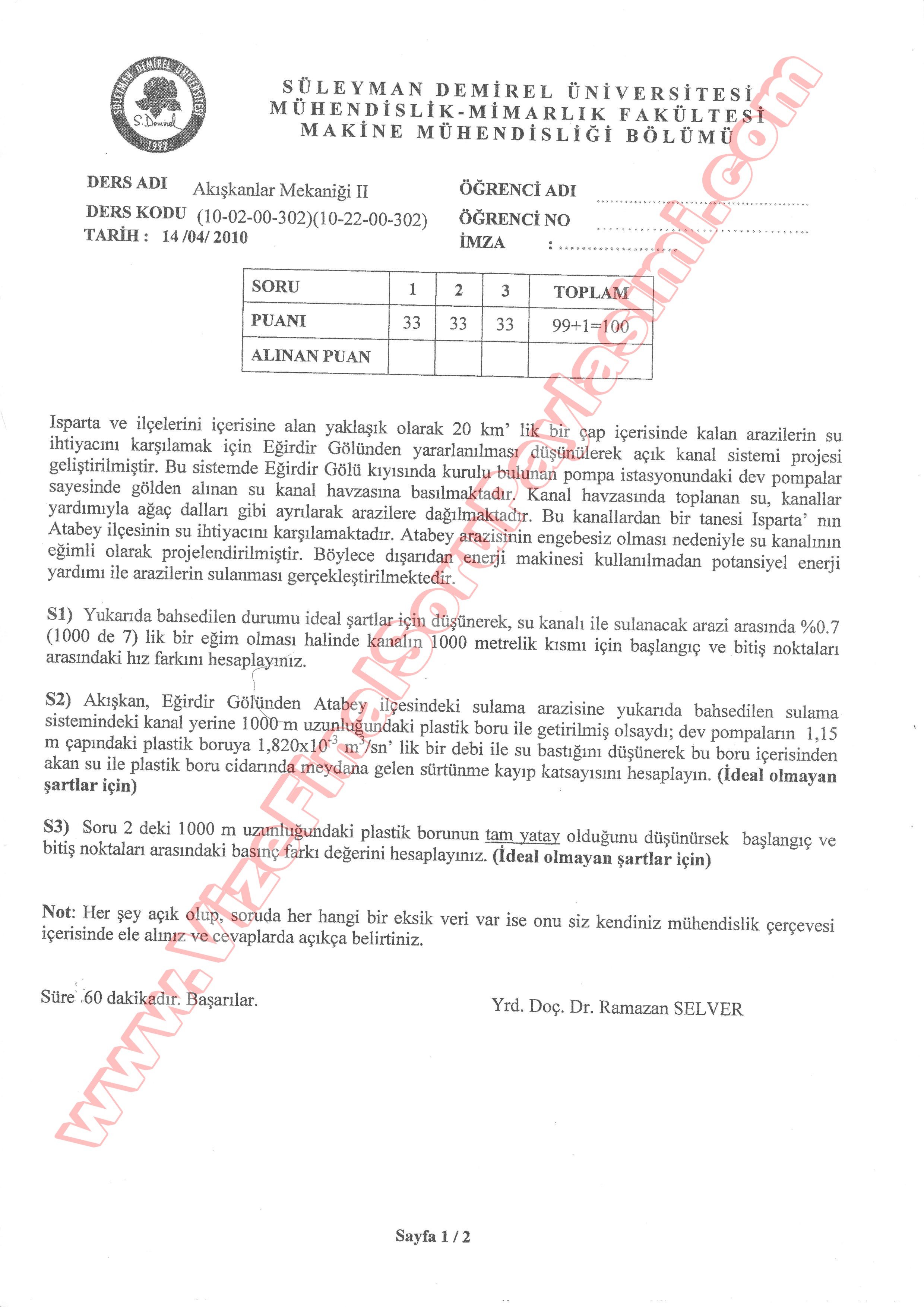 Vize ve Final Soruları / Süleyman Demirel Üniversitesi / Akışkanlar Mekaniği-2