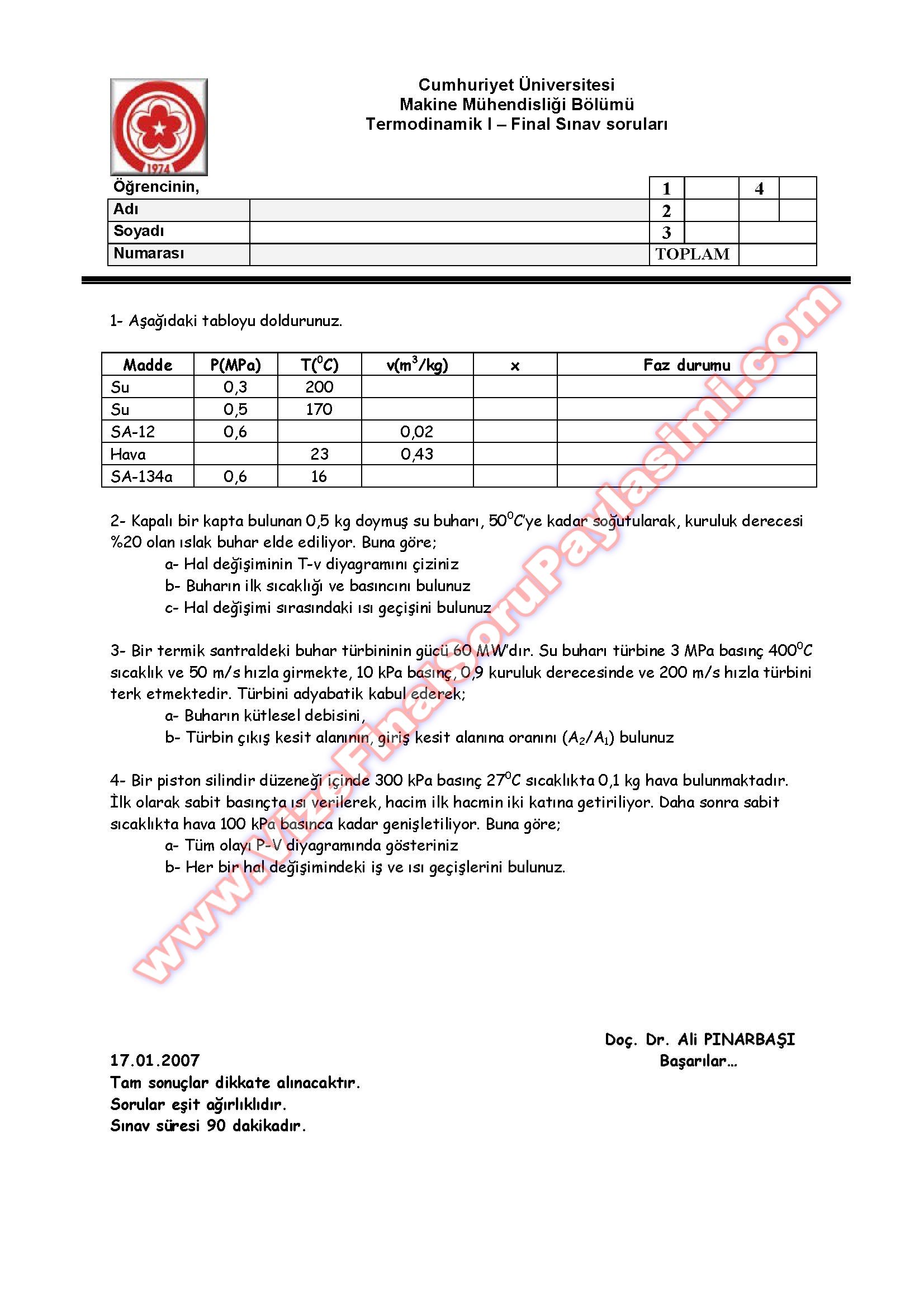 Cumhuriyet Üniversitesi Termodinamik-1 2007 Final Soruları