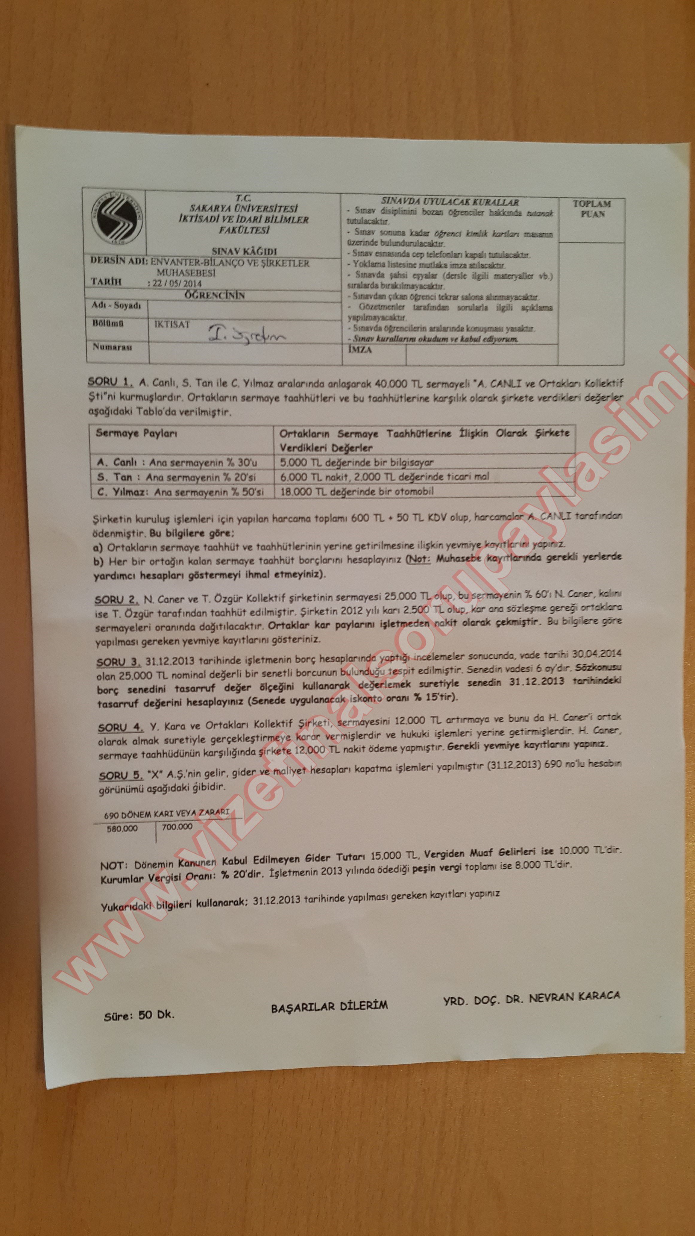 Vize ve Final Soruları / Sakarya Üniversitesi / Envanter Bilanço Ve Şirketler Muhasebesi