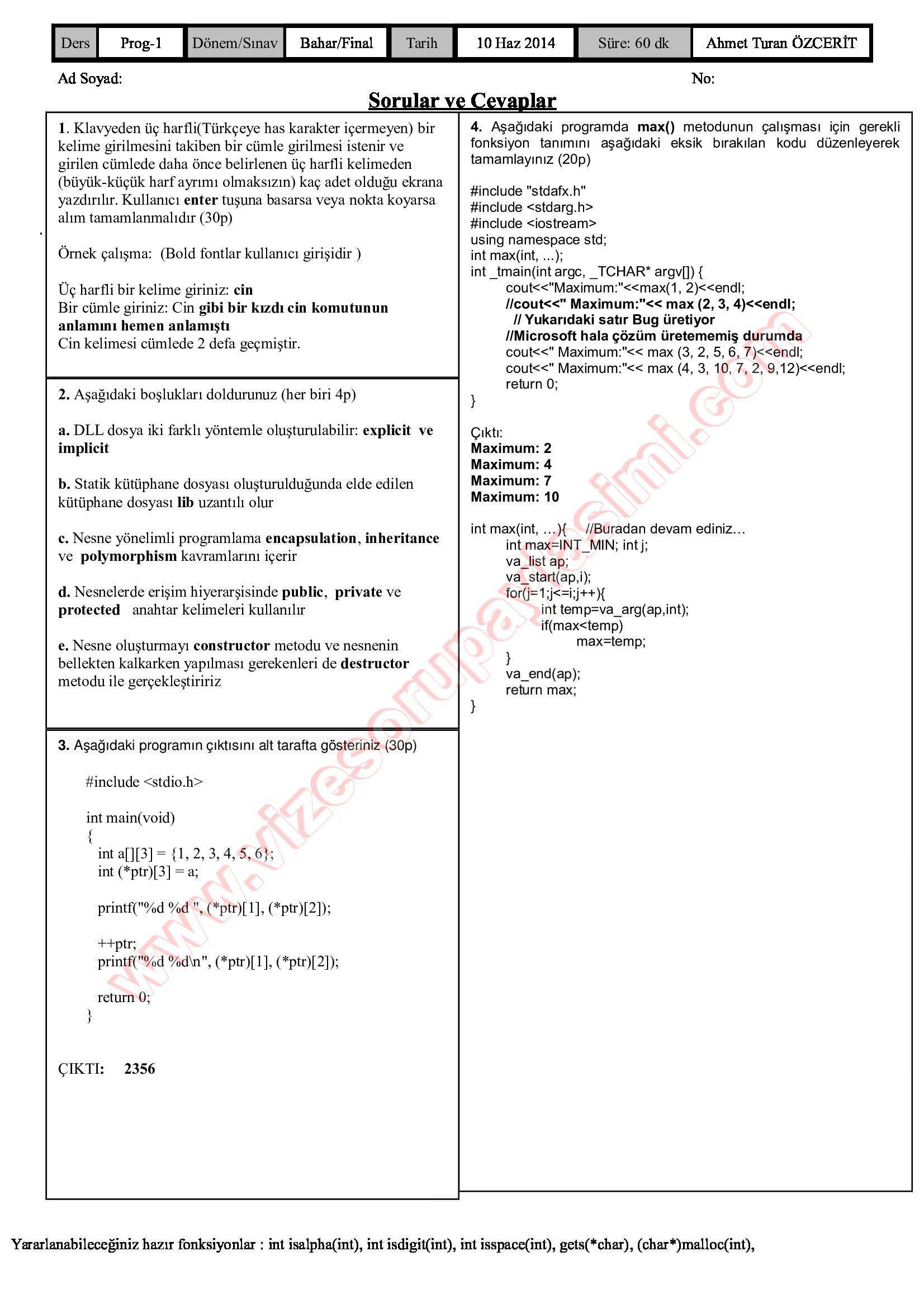 Programlama-1 Final Soruları Ve Cevapları - 10.06.2014