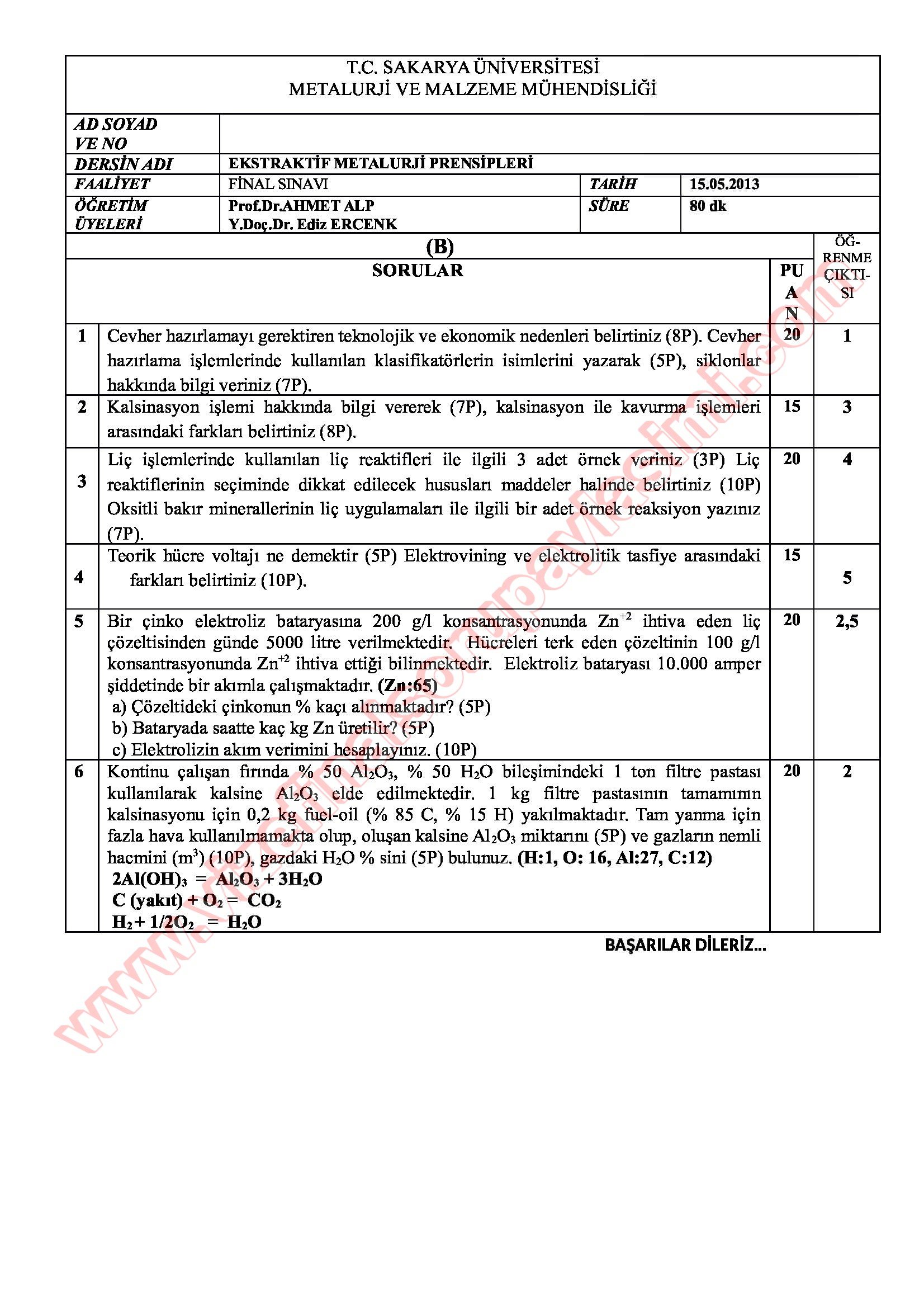 Ekstraktif Metalurji Prensibleri Vize Soruları Ve Cevapları - 15.05.2013