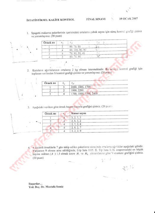 Vize ve Final Soruları / Selçuk Üniversitesi / İstatistiksel Kalite Kontrol