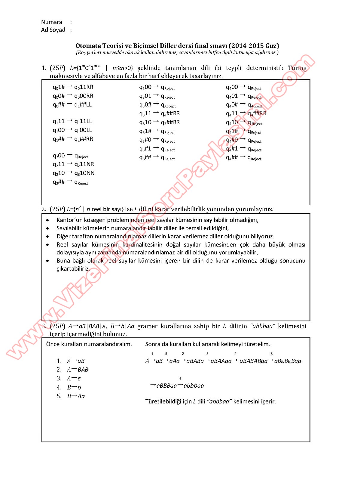 Otomata Teorisi ve Biçimsel Diller Final Soruları 29-04-2015, 13:30