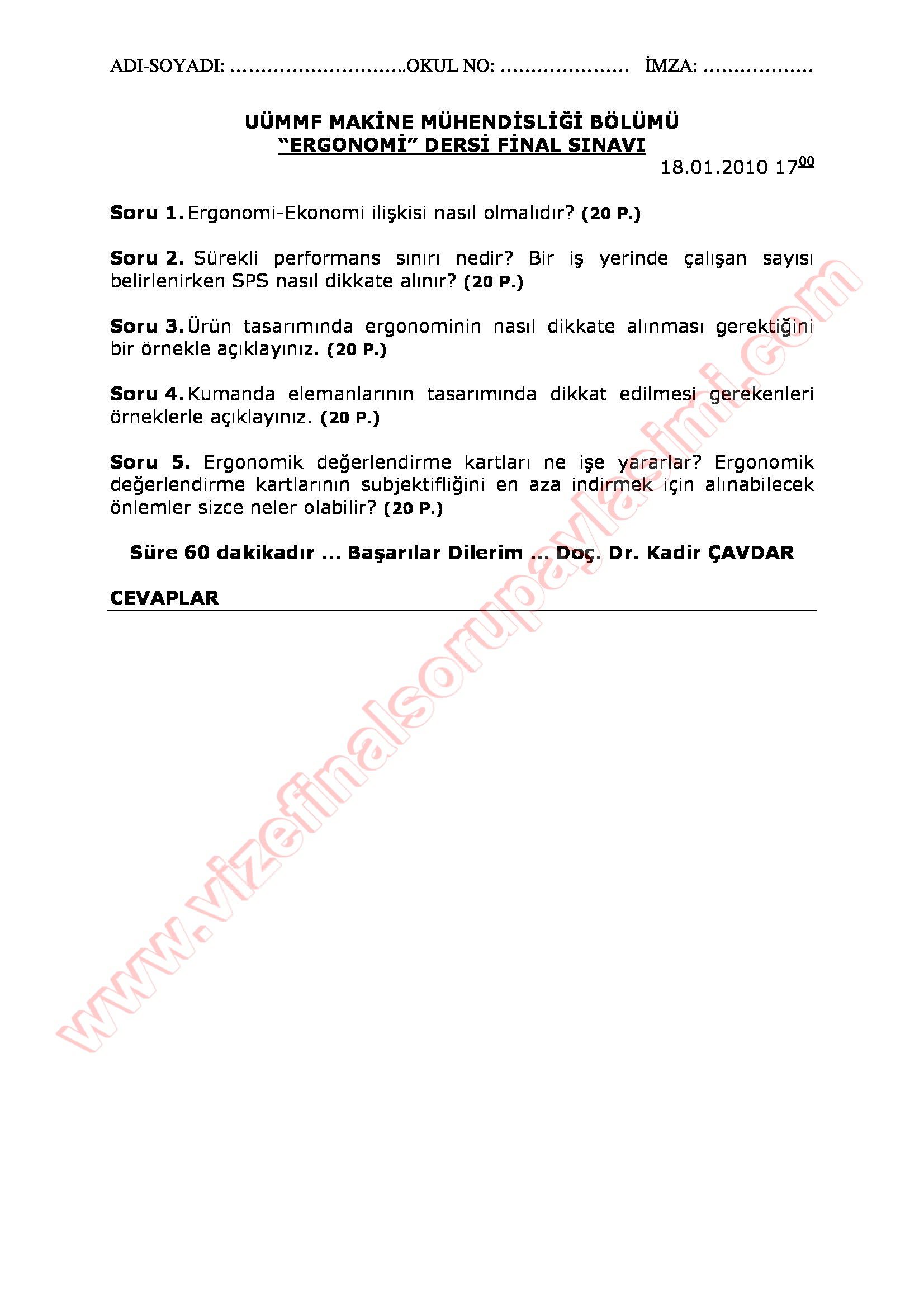 Vize ve Final Soruları / Uludağ Üniversitesi / Ergonomi Dersi