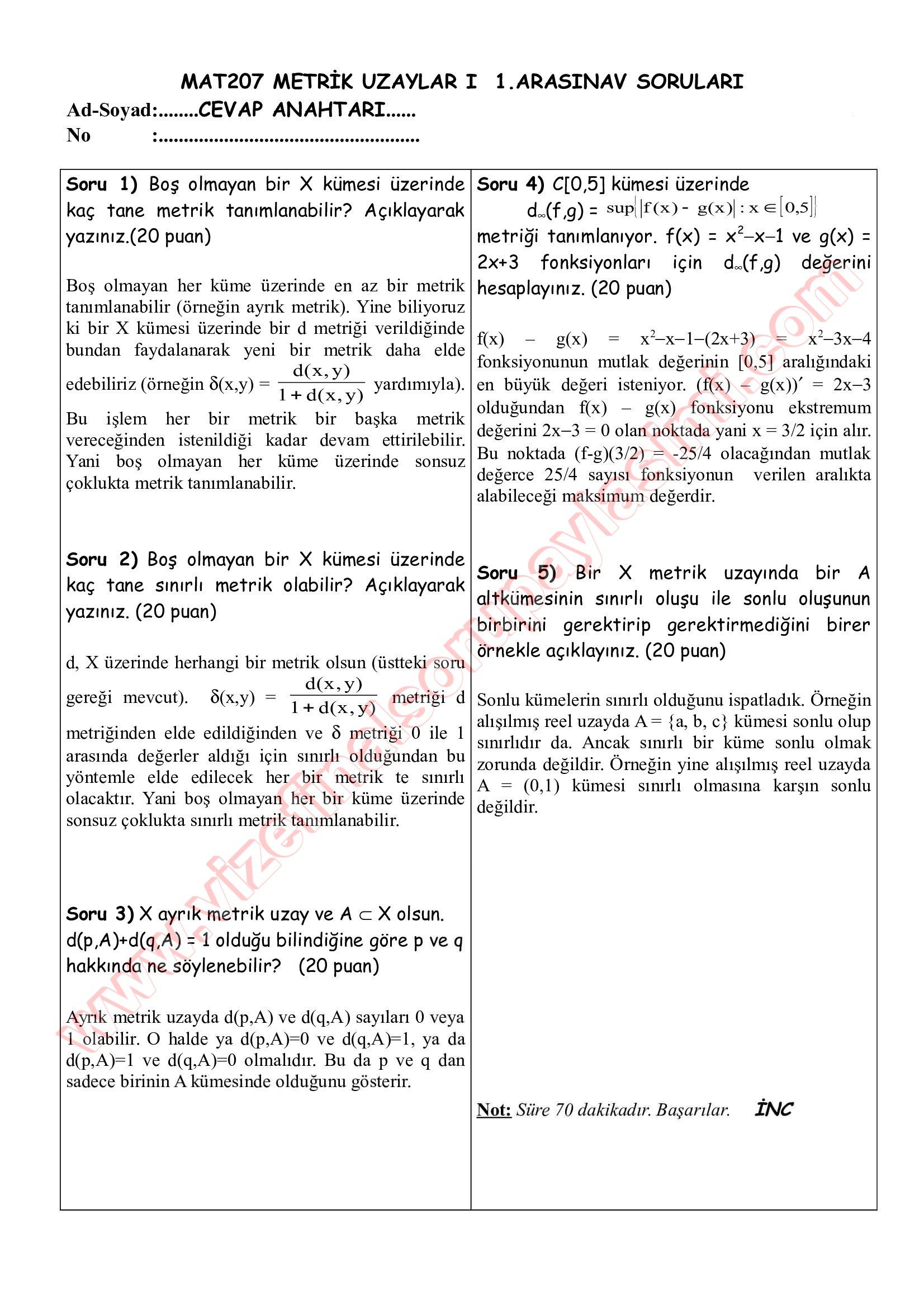 Metrik Uzaylar-1 Final Soruları Ve Cevapları 13-05-2015, 15:00