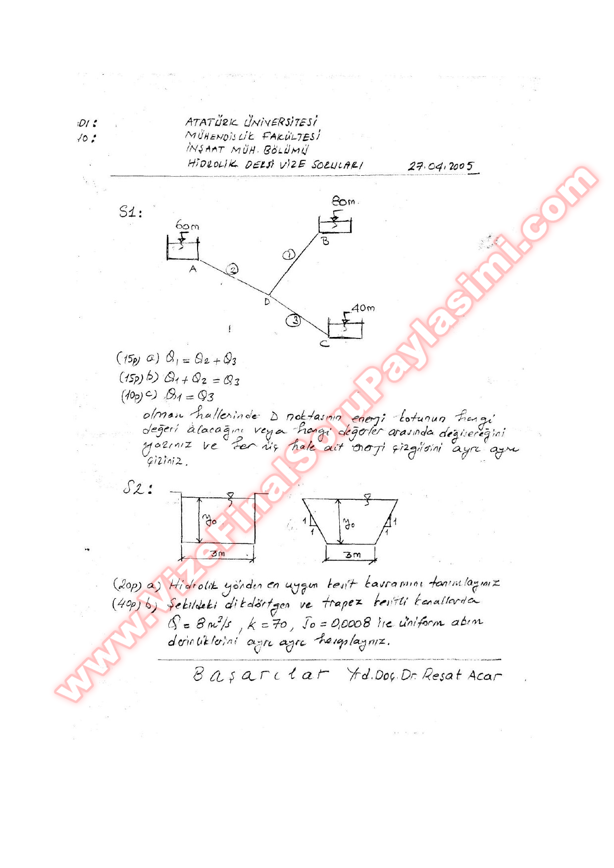 Vize ve Final Soruları / Erzurum Atatürk Üniversitesi / Hidrolik Dersi