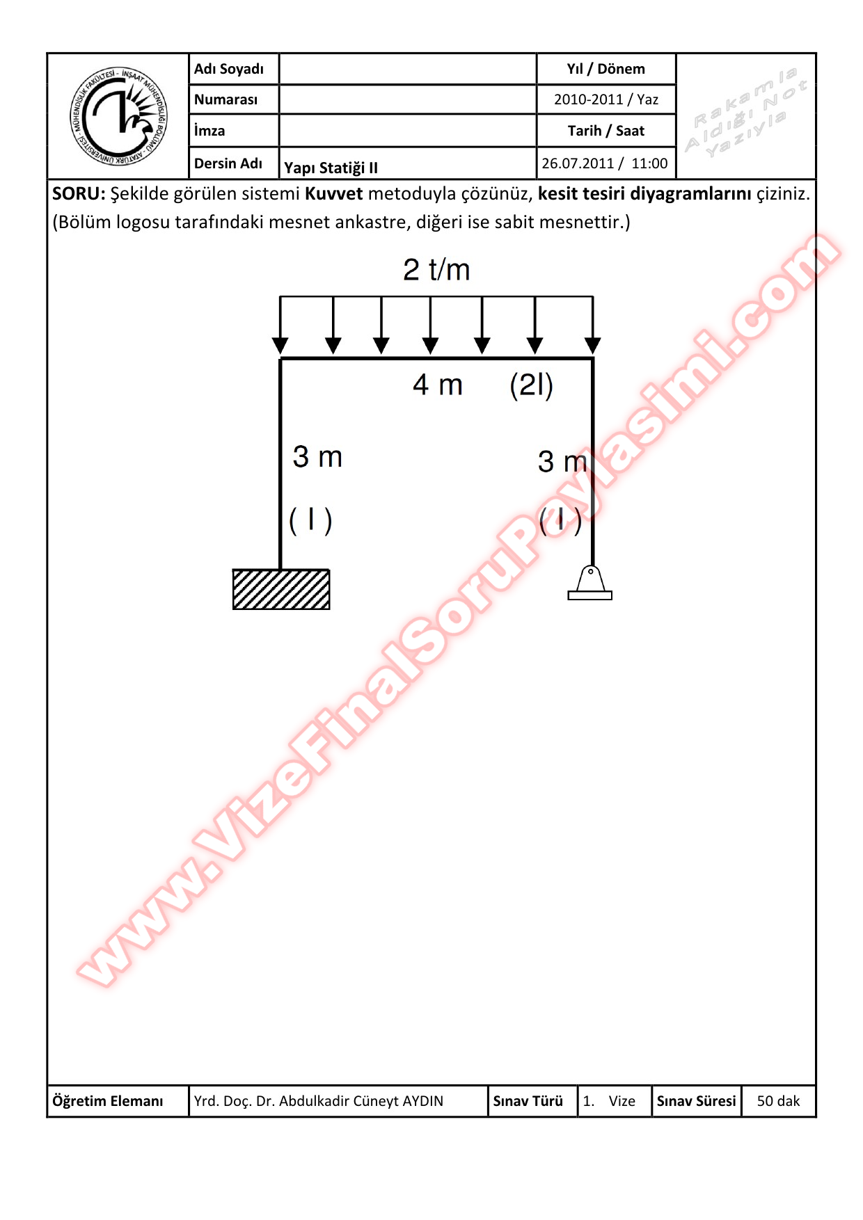 Yapı Statiği Vize2 Soruları -2011 15-05-2015, 13:58