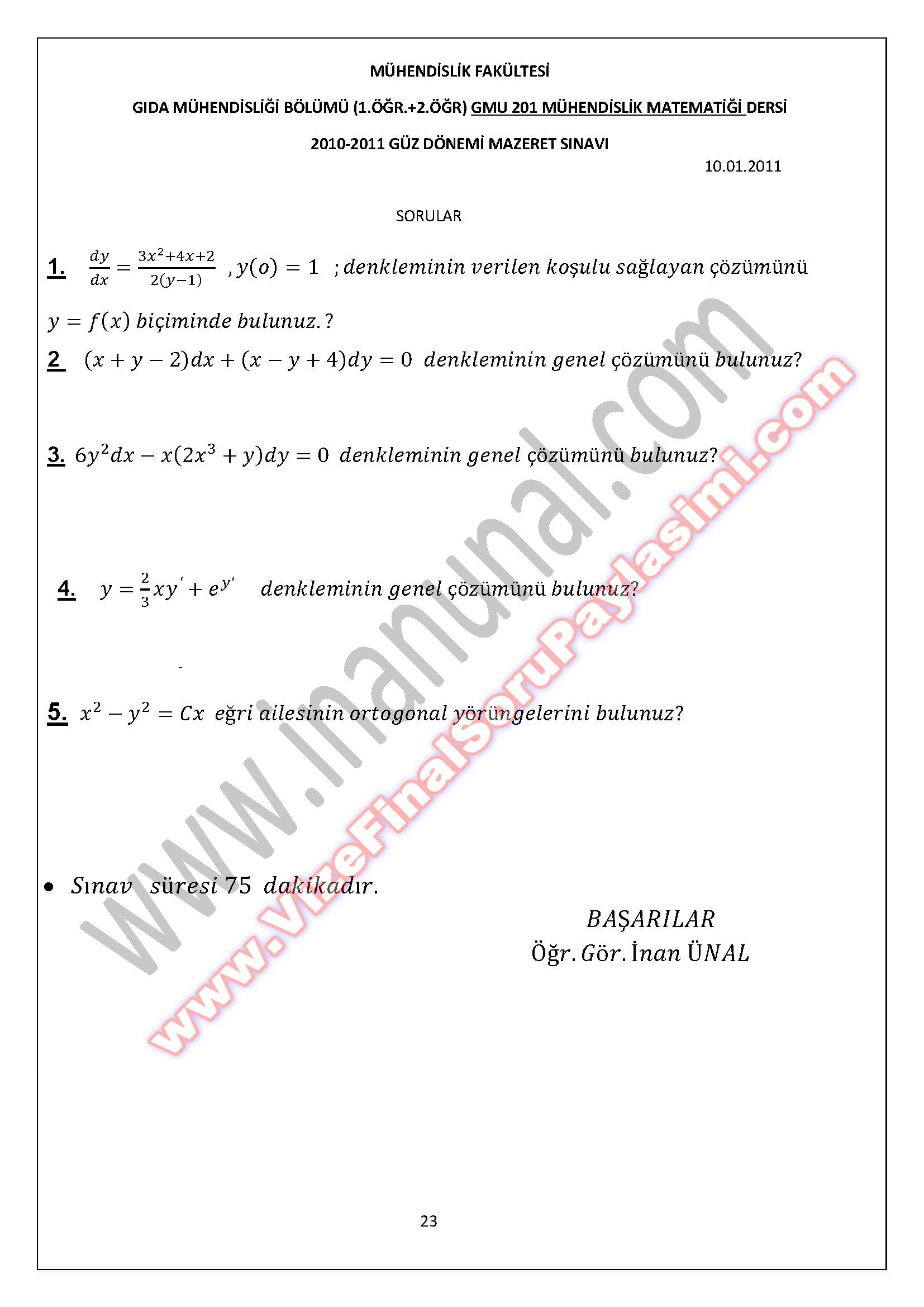 Mühendislik Matematiği (Diferansiyel Denklemler) Mazeret Soruları - 10.01.2011