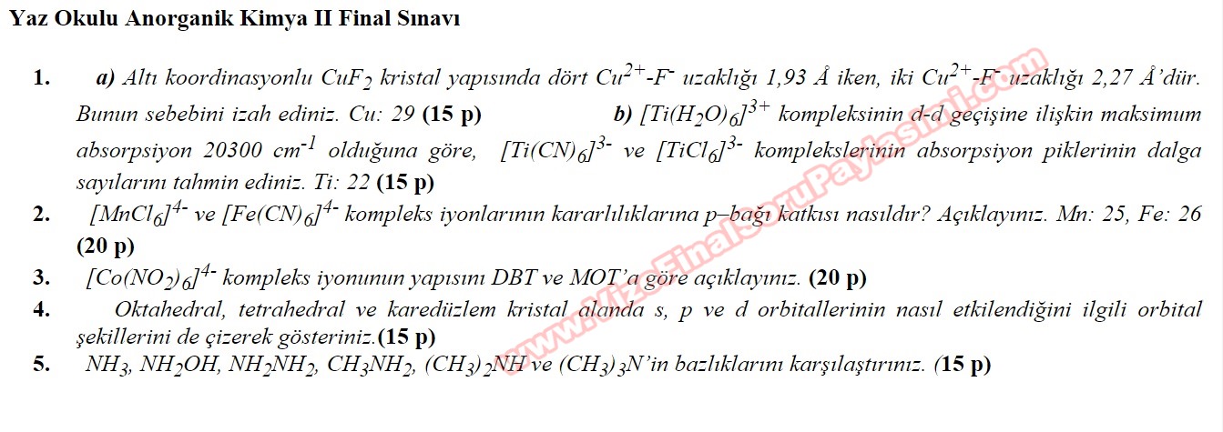 anorganik kimya2 kimya-2 kimya final sorulari yaz okulu gop