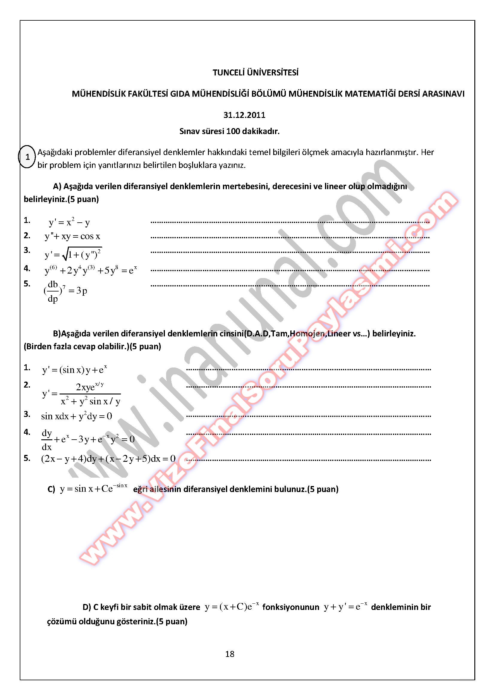 Tunceli Üniversitesi Mühendislik Matematiği Diferansiyel Denklemler 31.12.2011-Vize Soruları