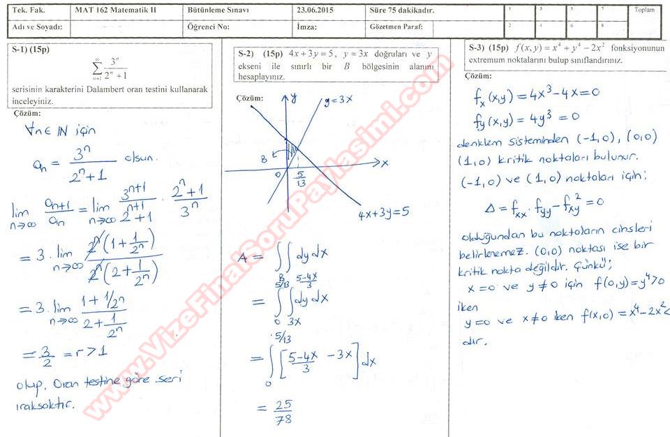 Matematik -2 Bütünleme Soruları ve Cevapları -2015