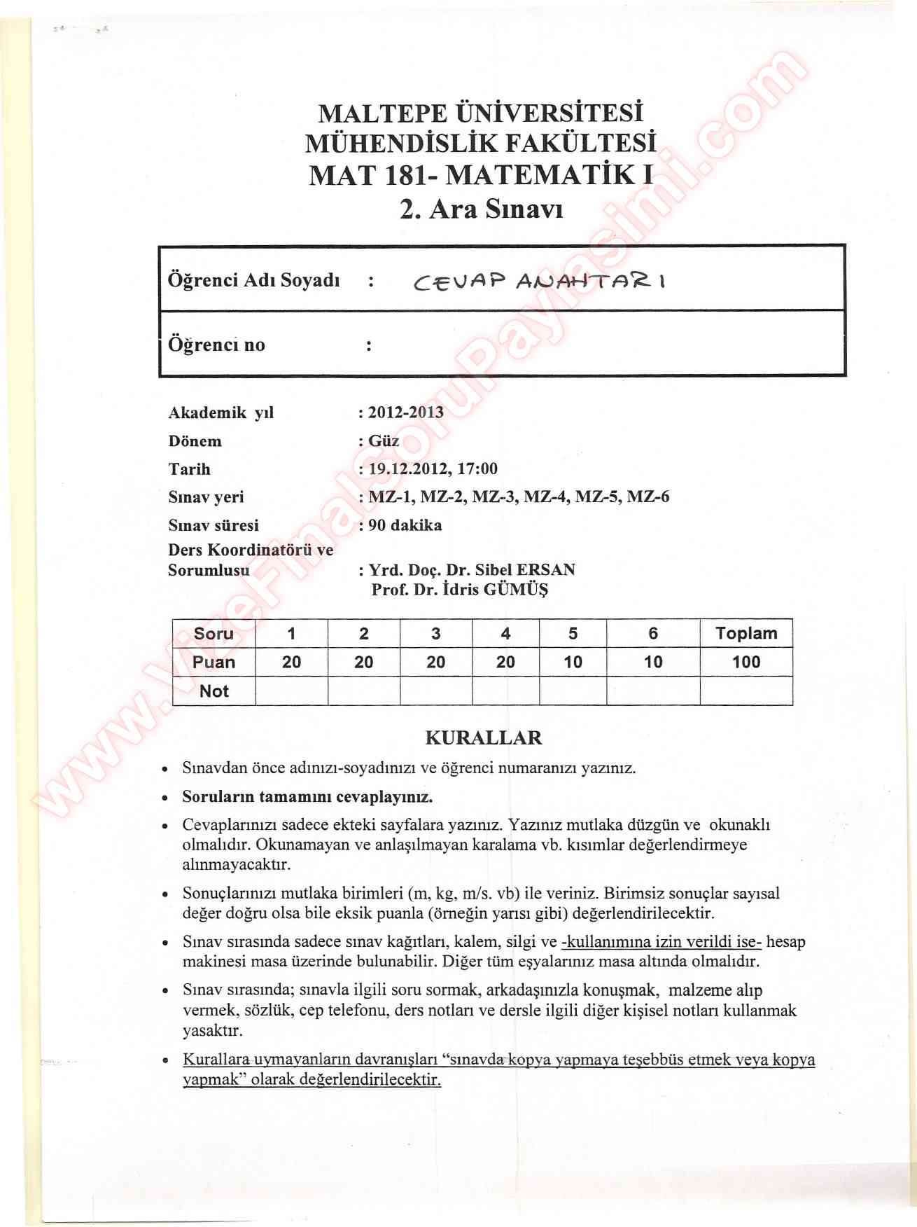 Vize ve Final Soruları / Maltepe Üniversitesi / Matematik -1